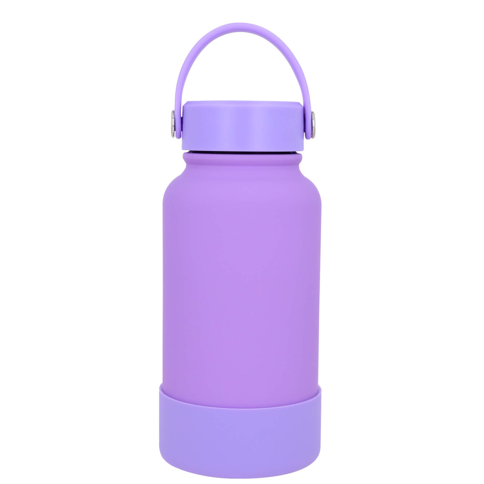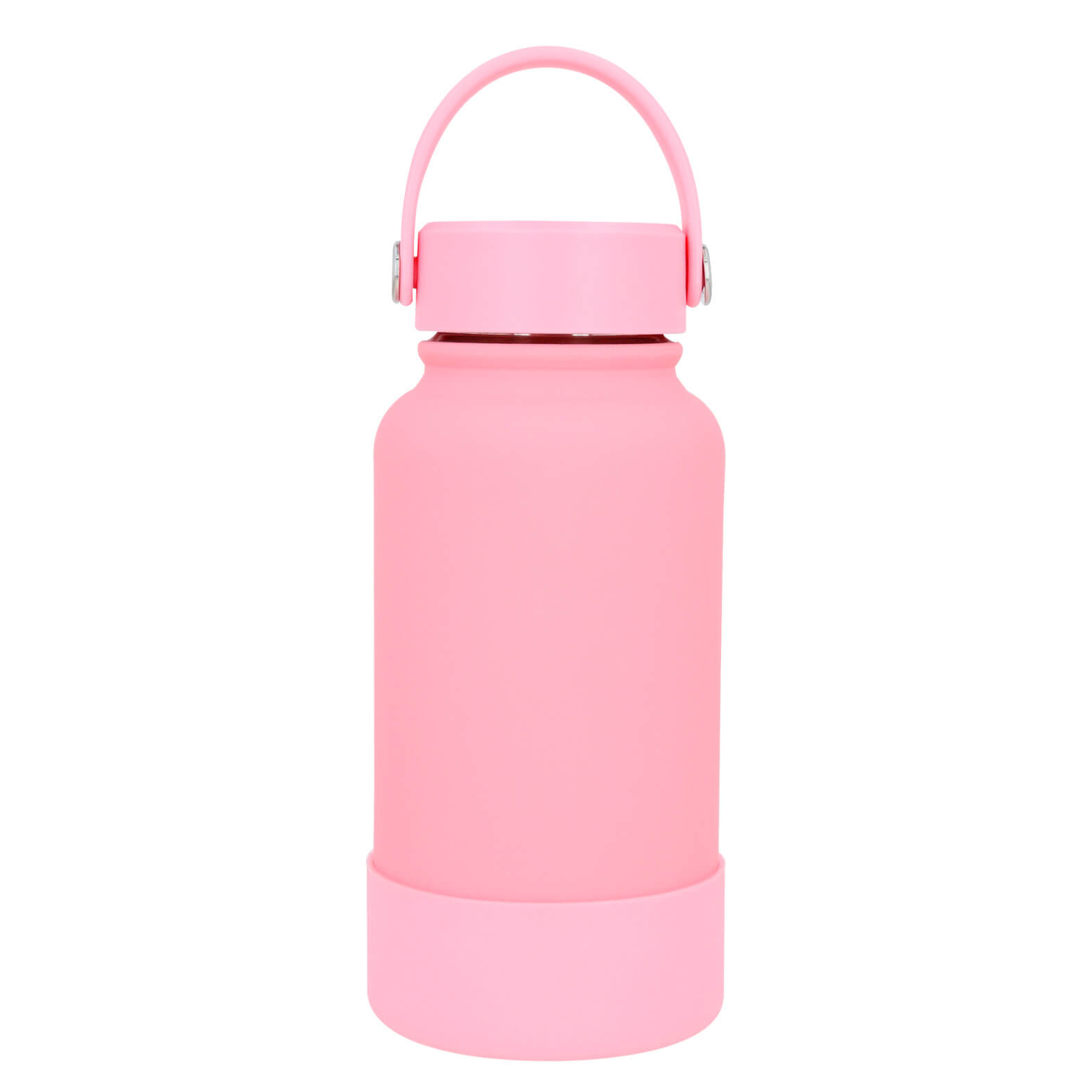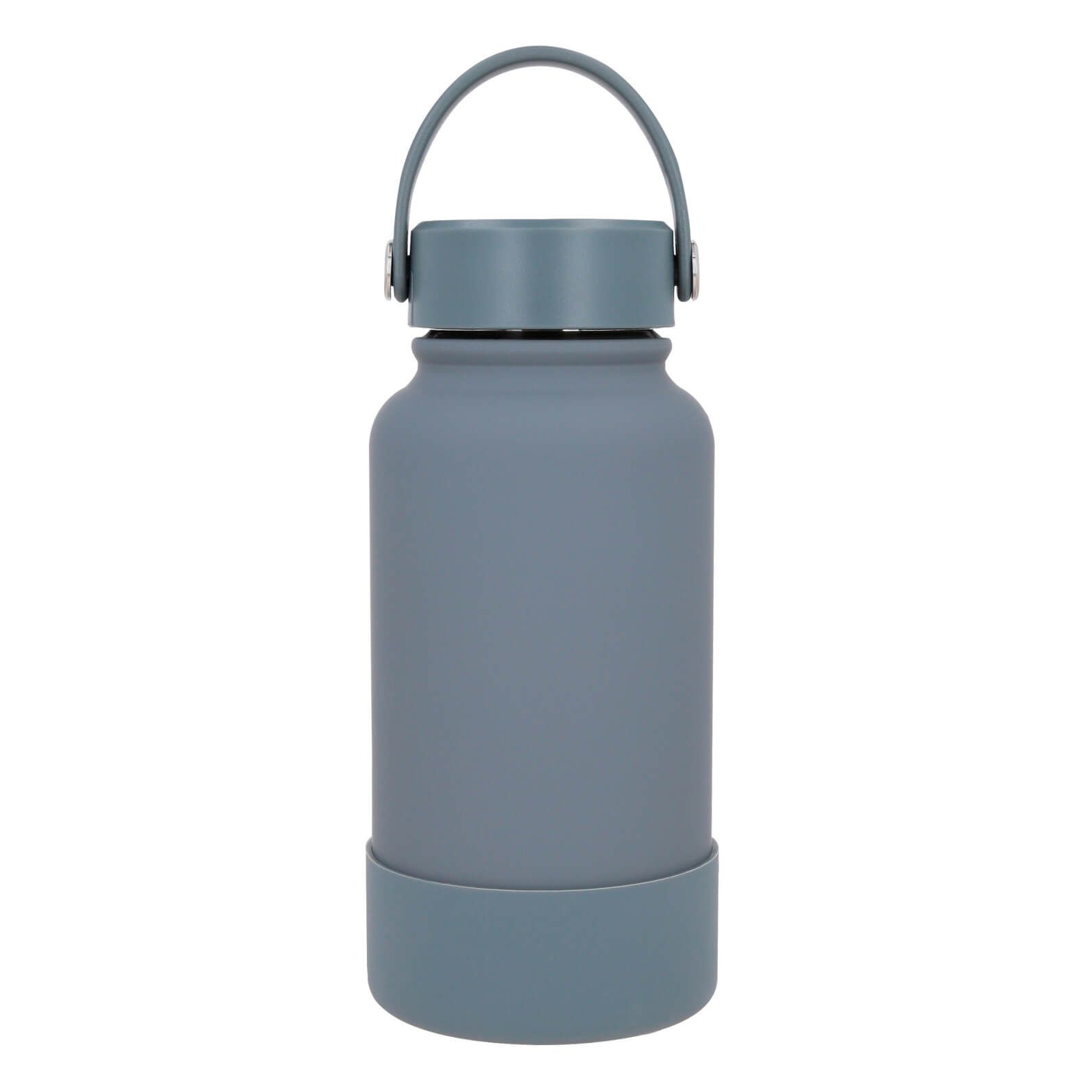Termo con doble pared de acero inoxidable, insulado al vacío, acabado rubber con silicón en la parte inferior y tapa enroscable con asa.
