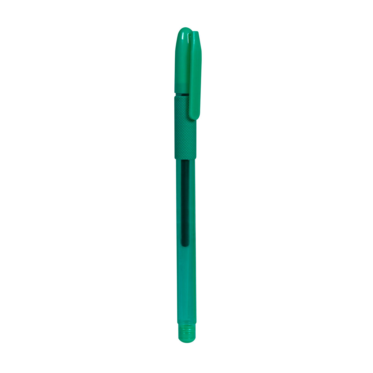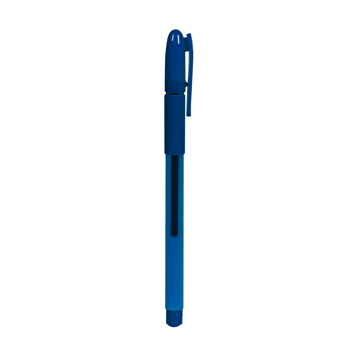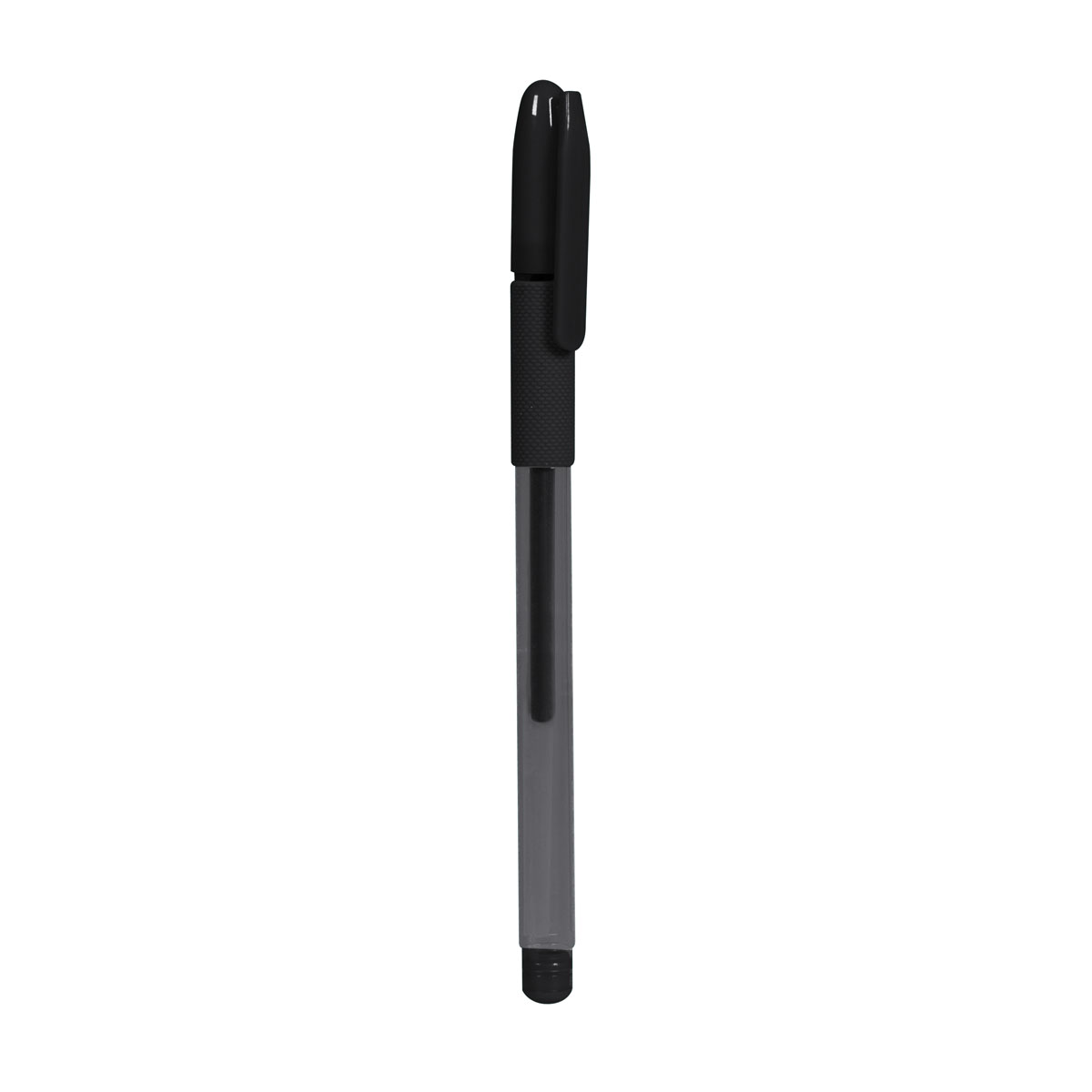 Boligrafo con tapon y grip antiderrapante.