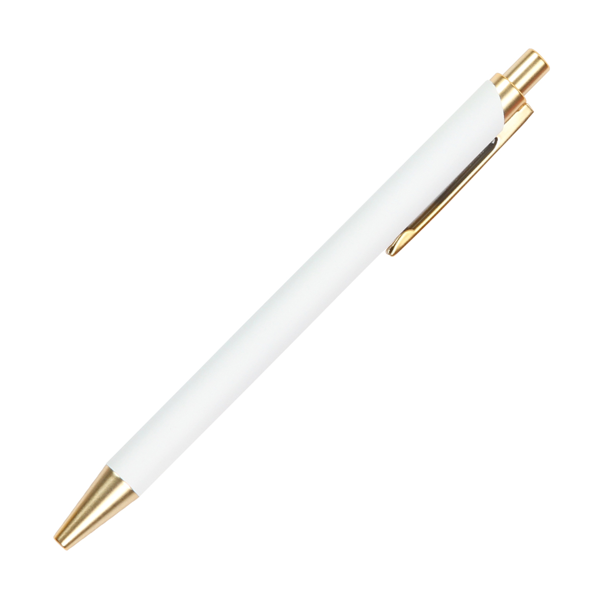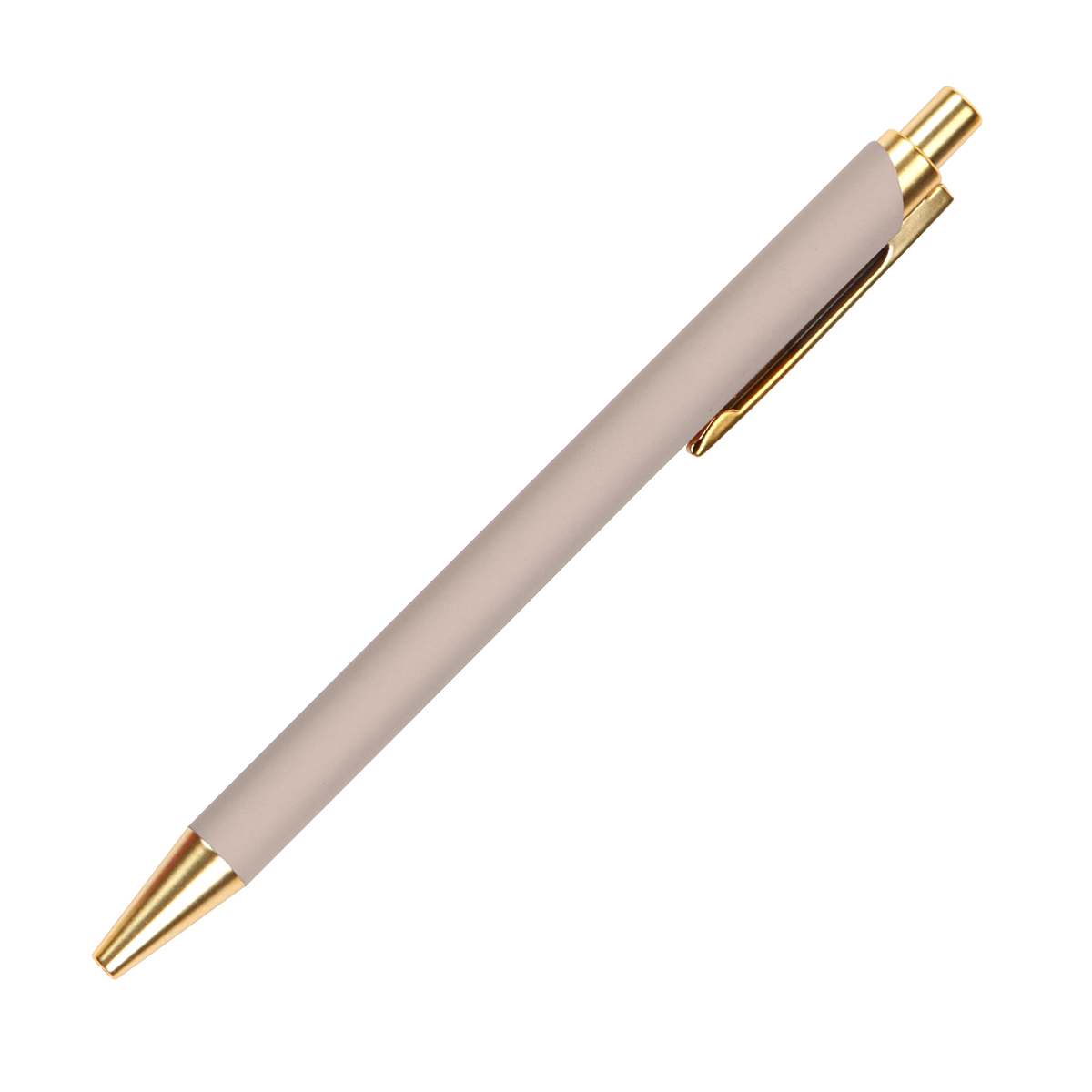 Bolígrafo con acción de empuje, barril fabricado de aluminio rociado metálico, detalles dorados. Tinta de escritura negra.