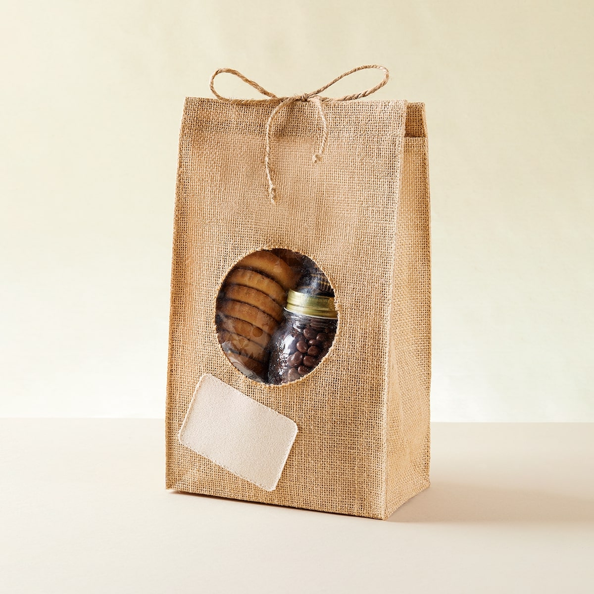 Bolsa de yute laminada. Cierre de cordon. Ventana de PCV y parche de algodon para impresion.