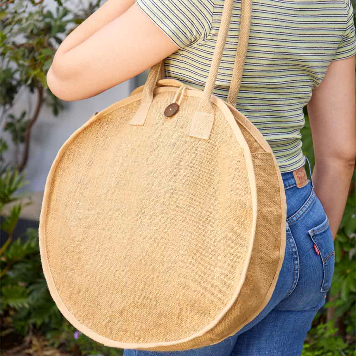 Bolsa con asas de algodon, fuelle y compartimento principal con elastico y boton de madera para abrir o cerrar. El yute es un producto natural el cual puede presentar variaciones en tonalidades y en la urdimbre y trama de la tela.