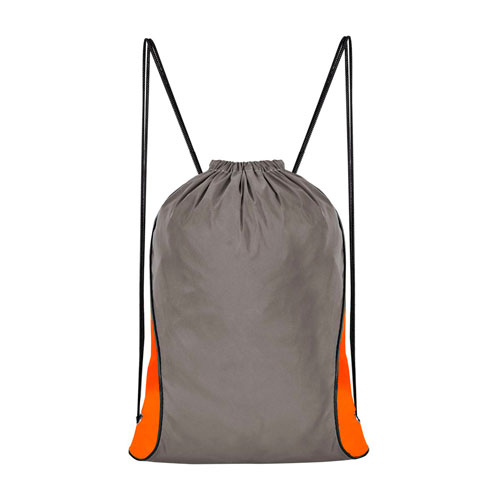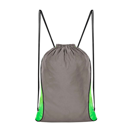 Bolsa-mochila con tirantes de cordon y cerrado de jareta. Parte frontal reflejante.