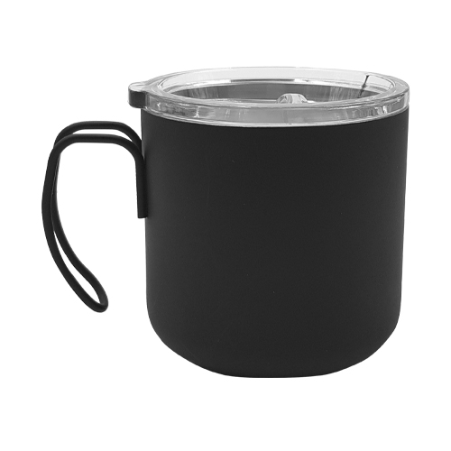 Taza con doble pared de acero inoxidable, asa metálica y tapa traslúcida de cierre a presión con seguro deslizable y boquilla. Incluye bolsa y caja individual.