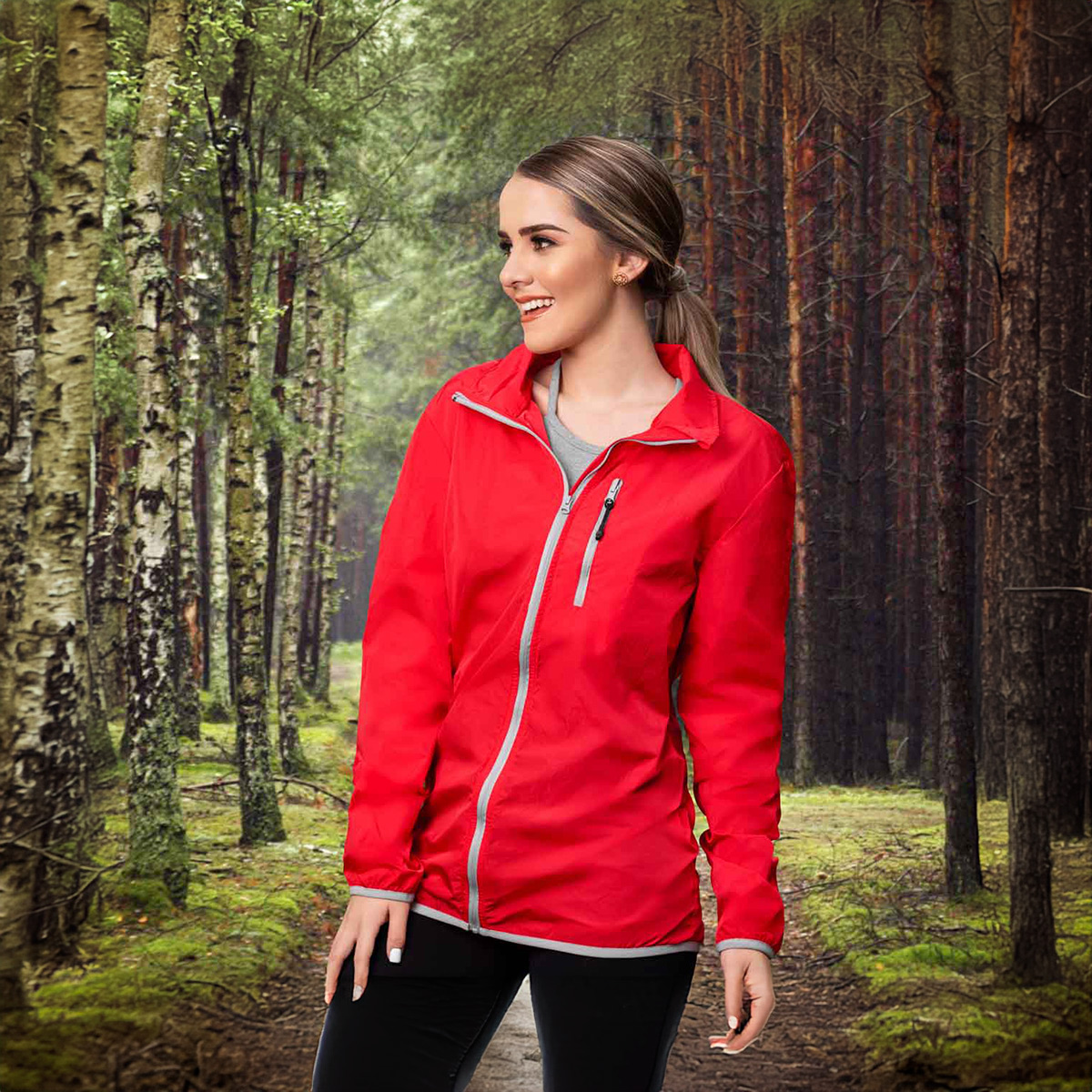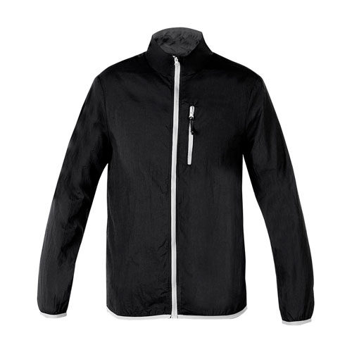 Chamarra deportiva ligera plegable con funda en cierre. 100% Poliester.