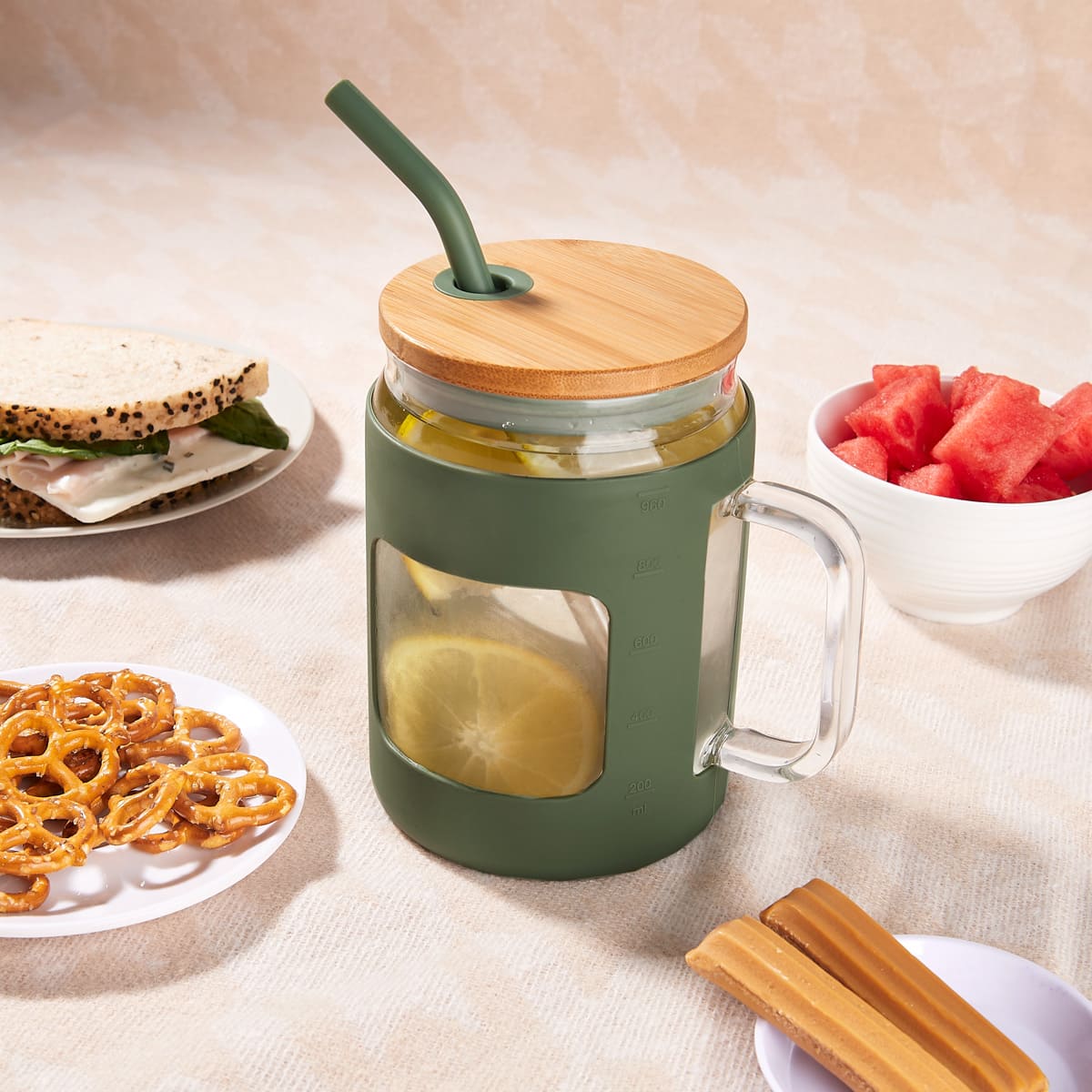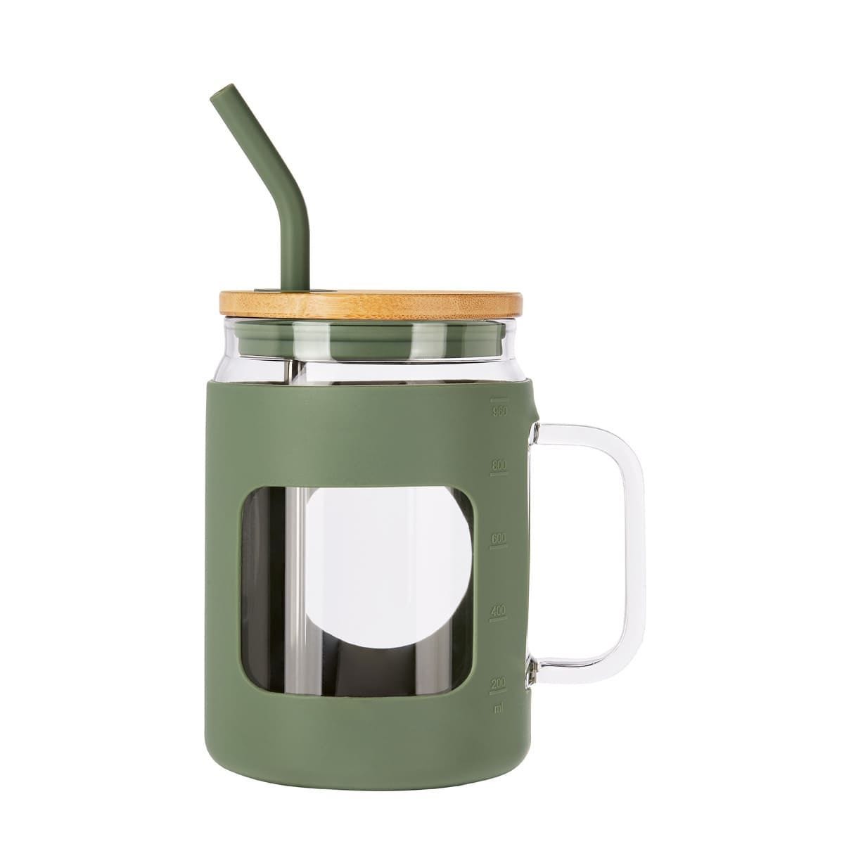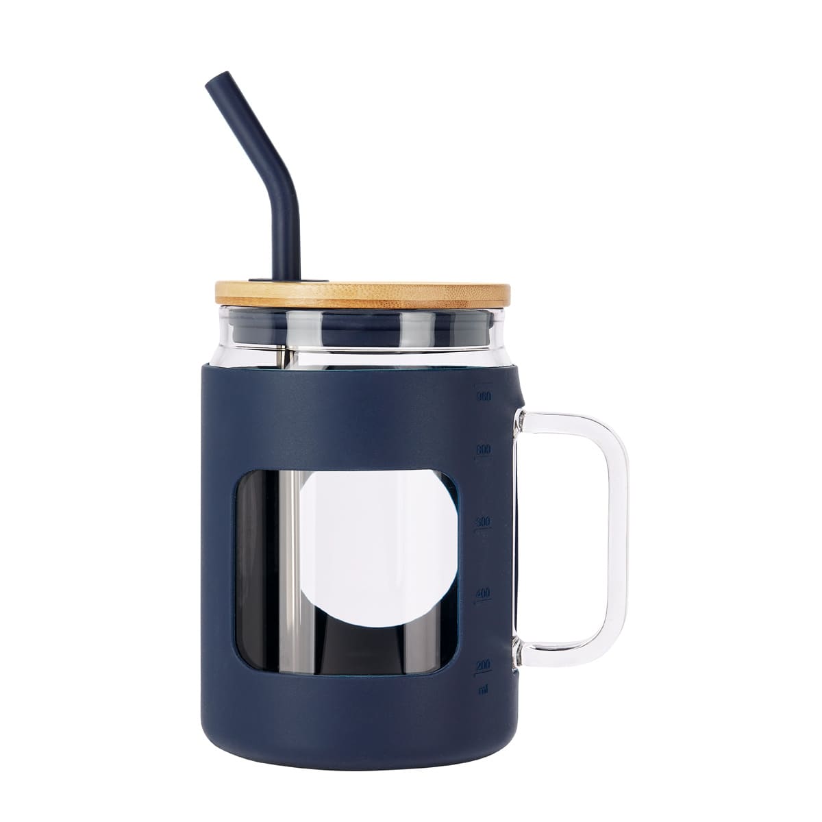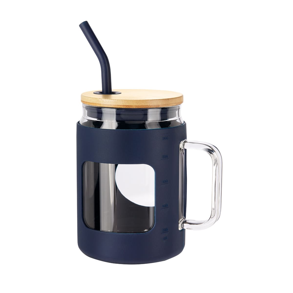 Cilindro de vidrio con asa y manga de silicon graduada en ml. Tapa de bambu con sistema de push y ranura para popote. Incluye popote metalico con boquilla de silicon. Vidrio resistente a bebidas calientes y frias. Caja individual incluida. El bambu es un producto natural el cual puede presentar variaciones en tonalidades y vetas.