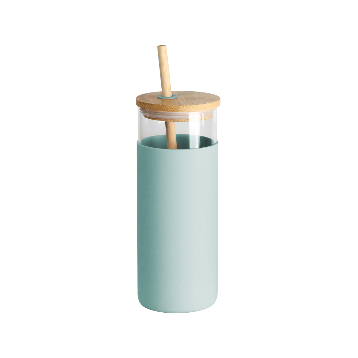 Cilindro de vidrio de borosilicato con manga de silicón, tapa de bambú con anillo de silicón y popote de bambú. Capacidad de 450 ml (15 oz). Incluye caja de cartón individual.