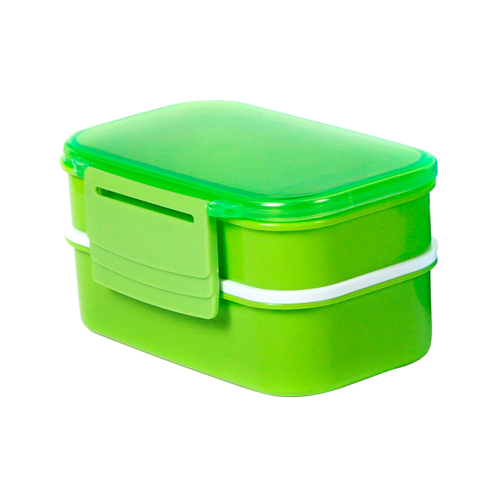 Contenedor de alimentos con dos compartimentos, fabricado en polipropileno y ABS. Cuenta con un broche de seguridad para un cierre hermético y viene con cubiertos (cuchara, tenedor y cuchillo).