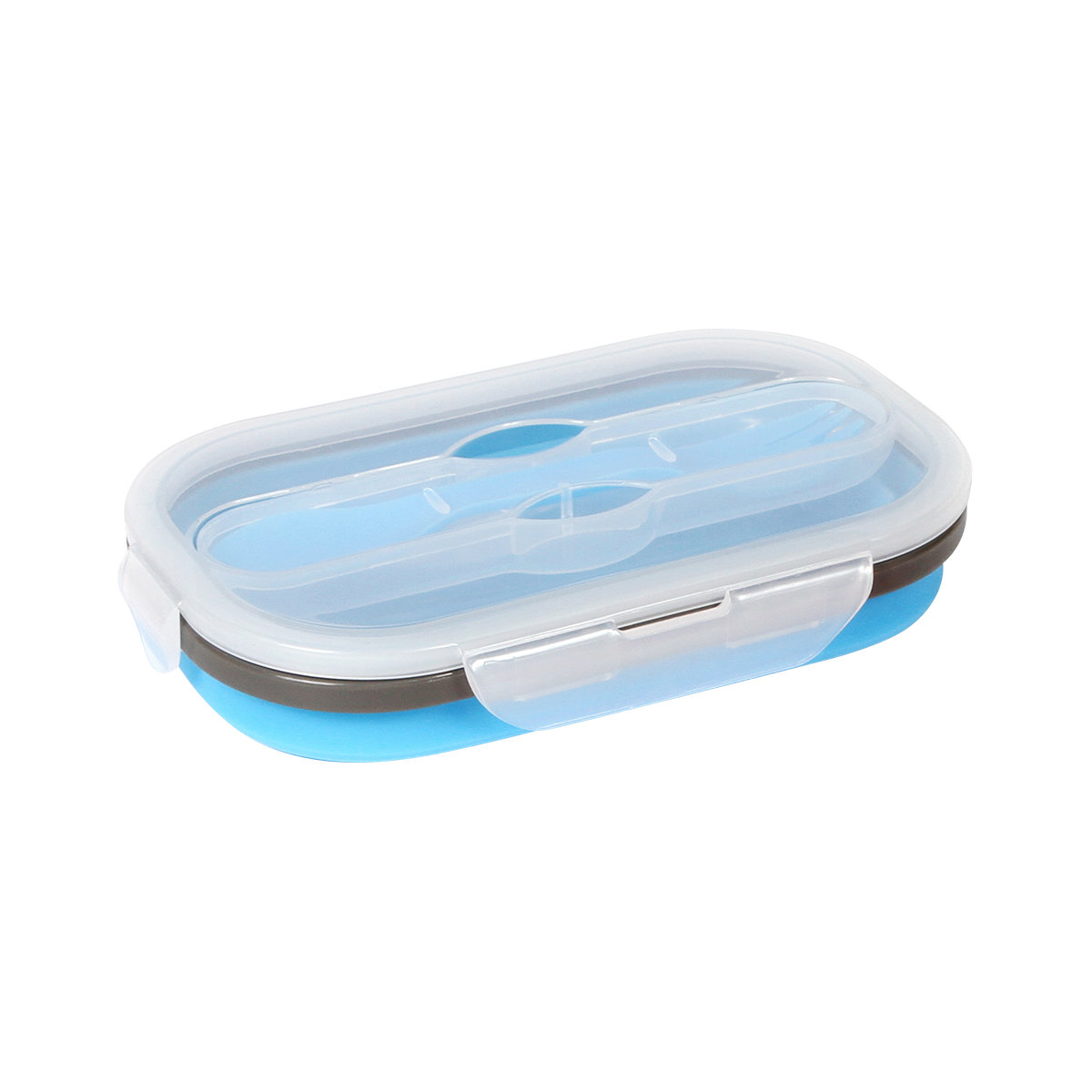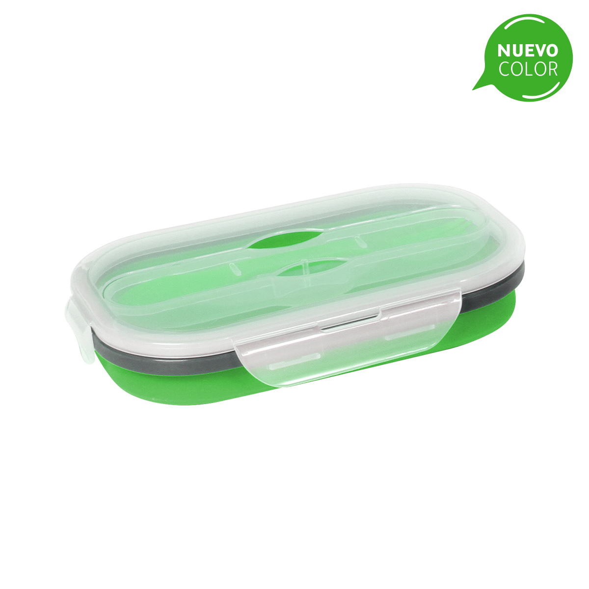 Contenedor de alimentos plegable fabricado en silicona. Cuenta con un broche de seguridad para un cierre hermético y un cubierto 3 en 1 (cuchara, tenedor y cuchillo) incluido.
