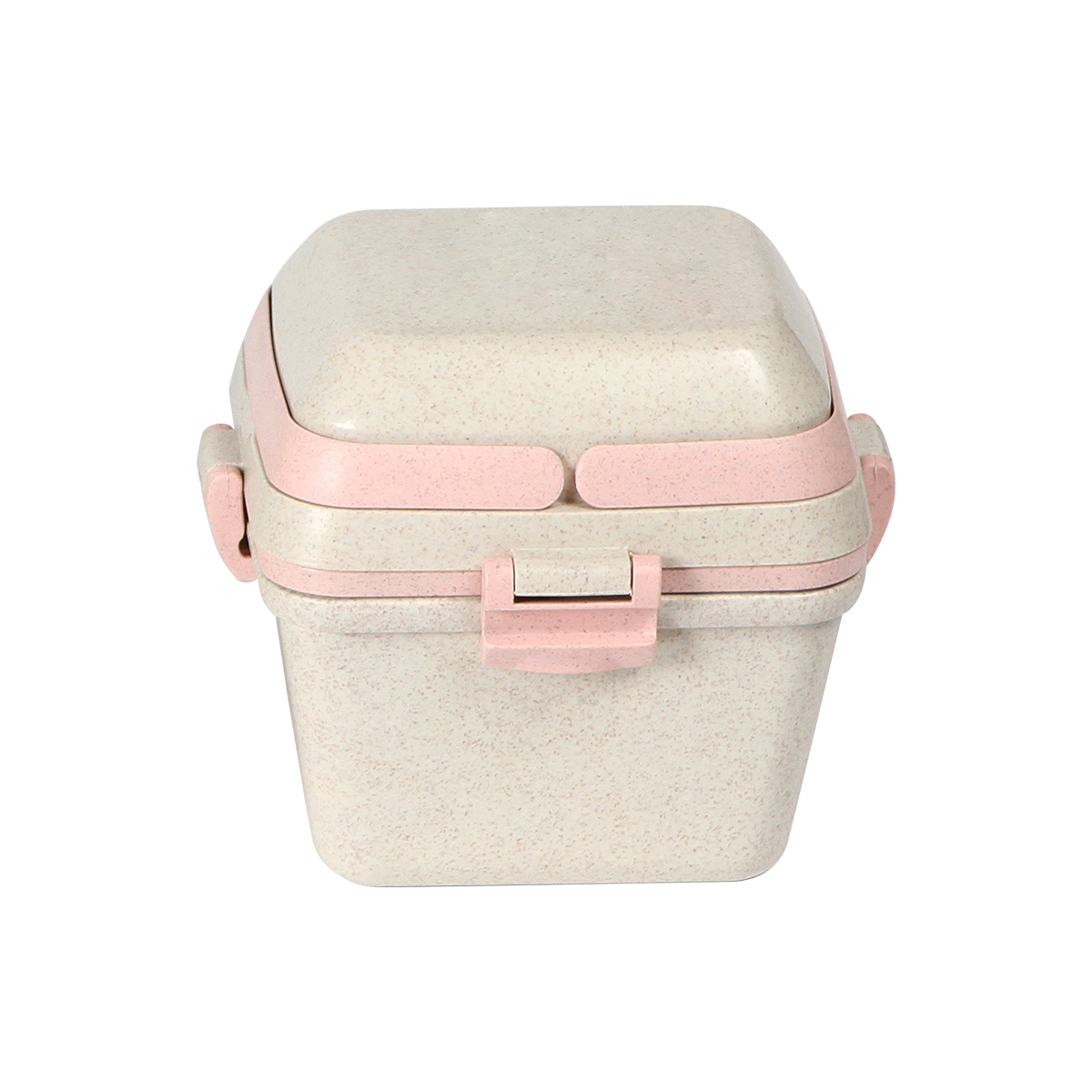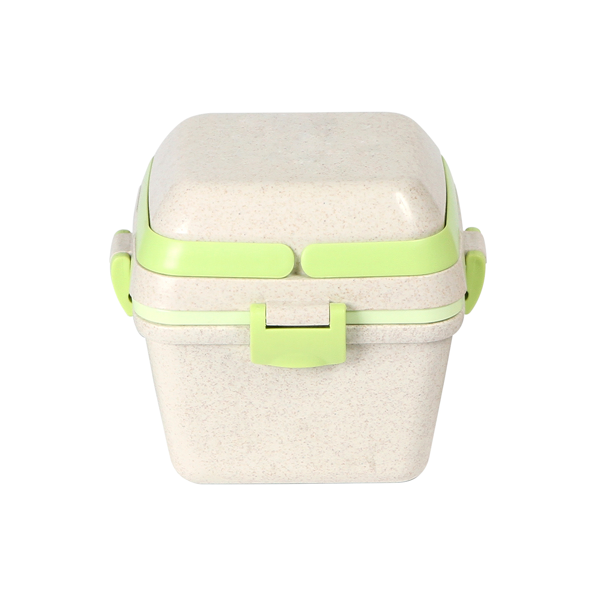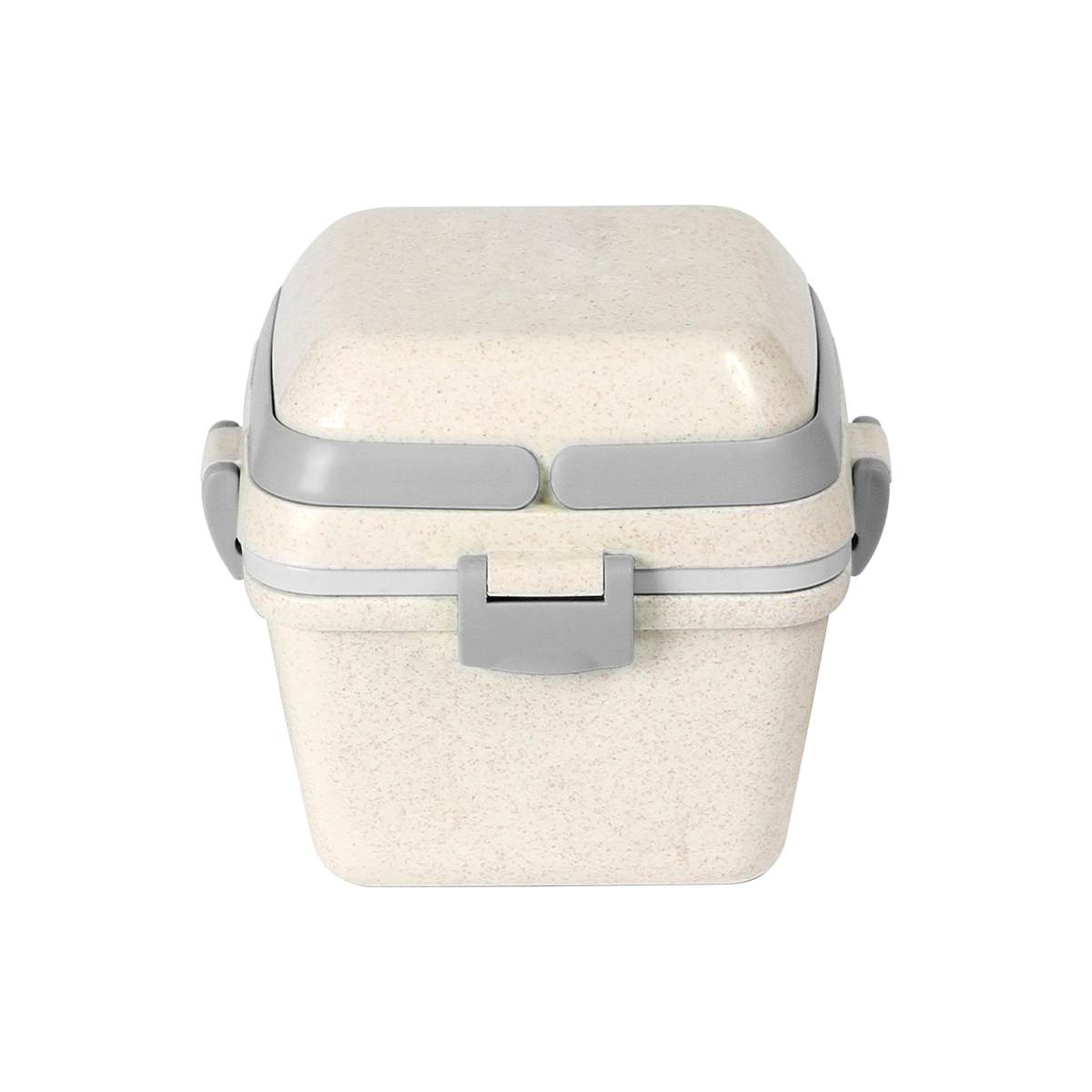 Contenedor para alimentos fabricado en fibra de trigo con PP (Polipropileno). Con 3 compartimentos (650+350+150 ml) , asas superiores, clips de seguridad y cuchara.