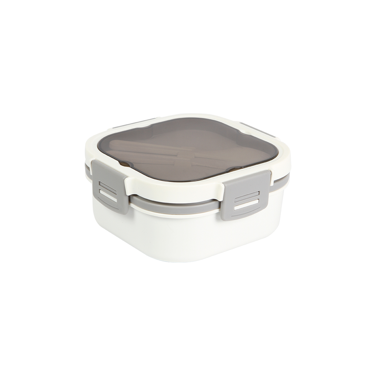 Contenedor de alimentos fabricado en plástico PP con 2 compartimentos, tapa con 4 pestañas de seguridad, diferentes divisiones y un contenedor pequeño con tapa, incluye tenedor y cuchara.