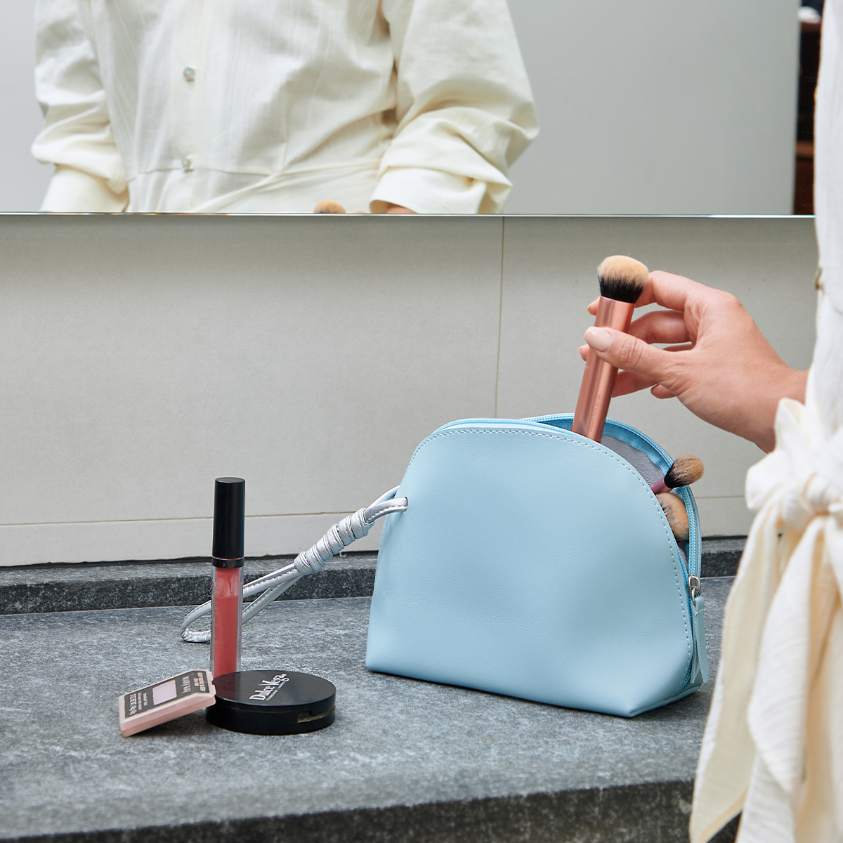 Cosmetiquera con fuelle. Compartimento principal con cierre. Incluye asa.