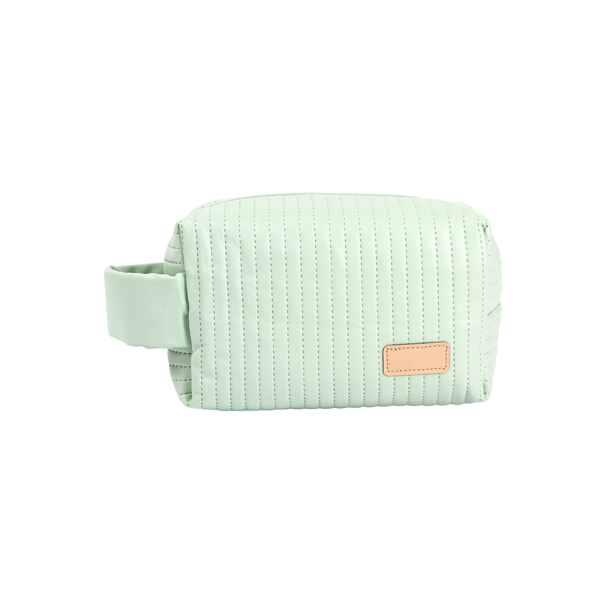 Bolsa cosmetiquera fabricada en PU (poliuretano). Cuenta con asa a un costado para facilitar su transporte y compartimentos interiores diseñados para organizar y separar los productos cosméticos y de cuidado personal, como cremas, maquillaje, cepillos, etc.