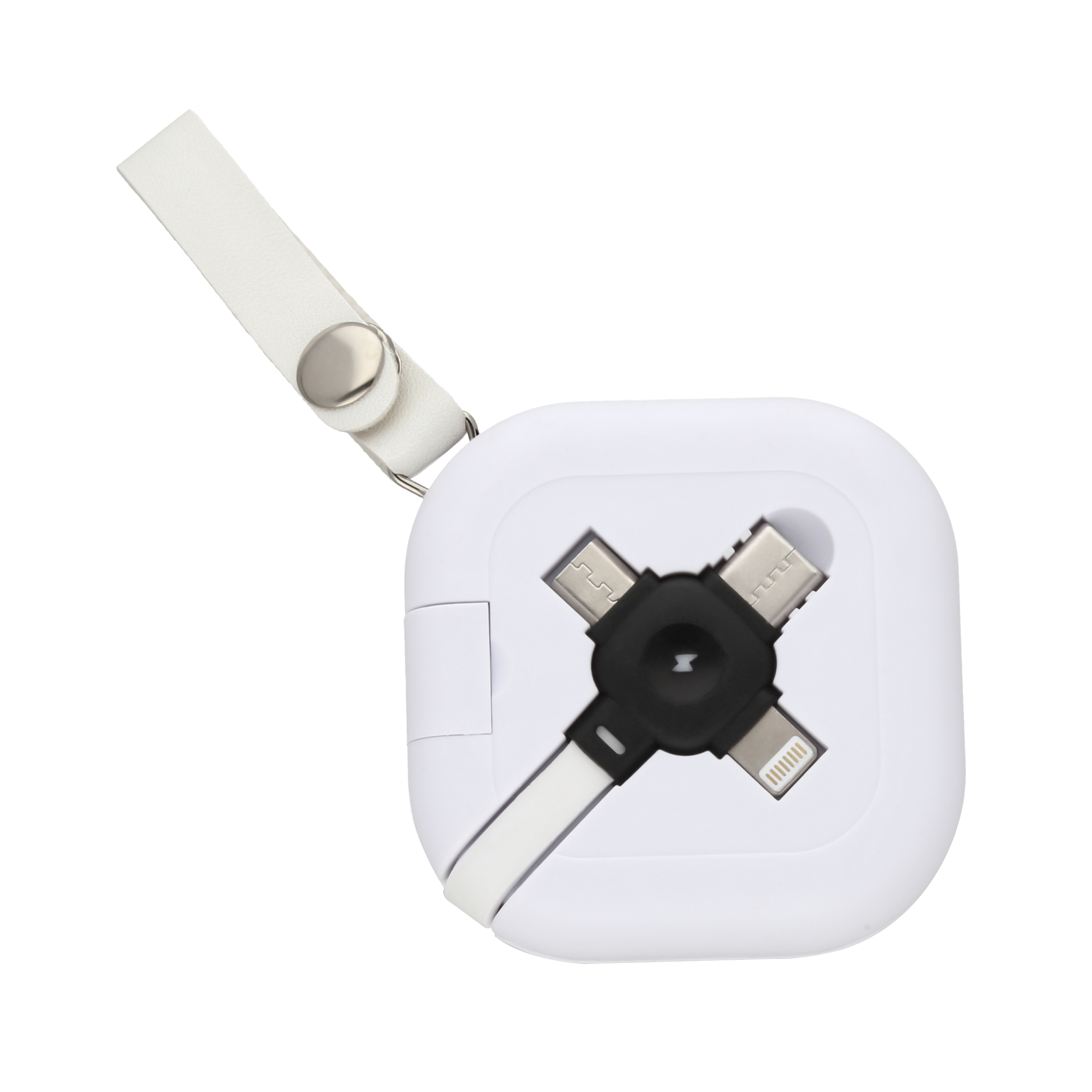 Cargador multifuncional con correa de curpiel y soporte para celular. Incluye entrada tipo usb, conector de salida lightning , tipo C y micro USB.