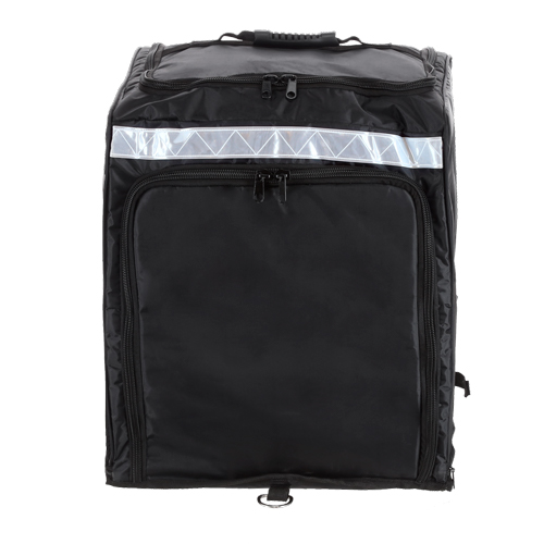 Maleta para delivery. Cuenta con 2 correas traseras ajustables, 4 ganchos en la parte inferior para una mejor sujeción, apertura frontal y superior con asa, franja reflejante al frente y bolsas de malla laterales. Es desmontable.