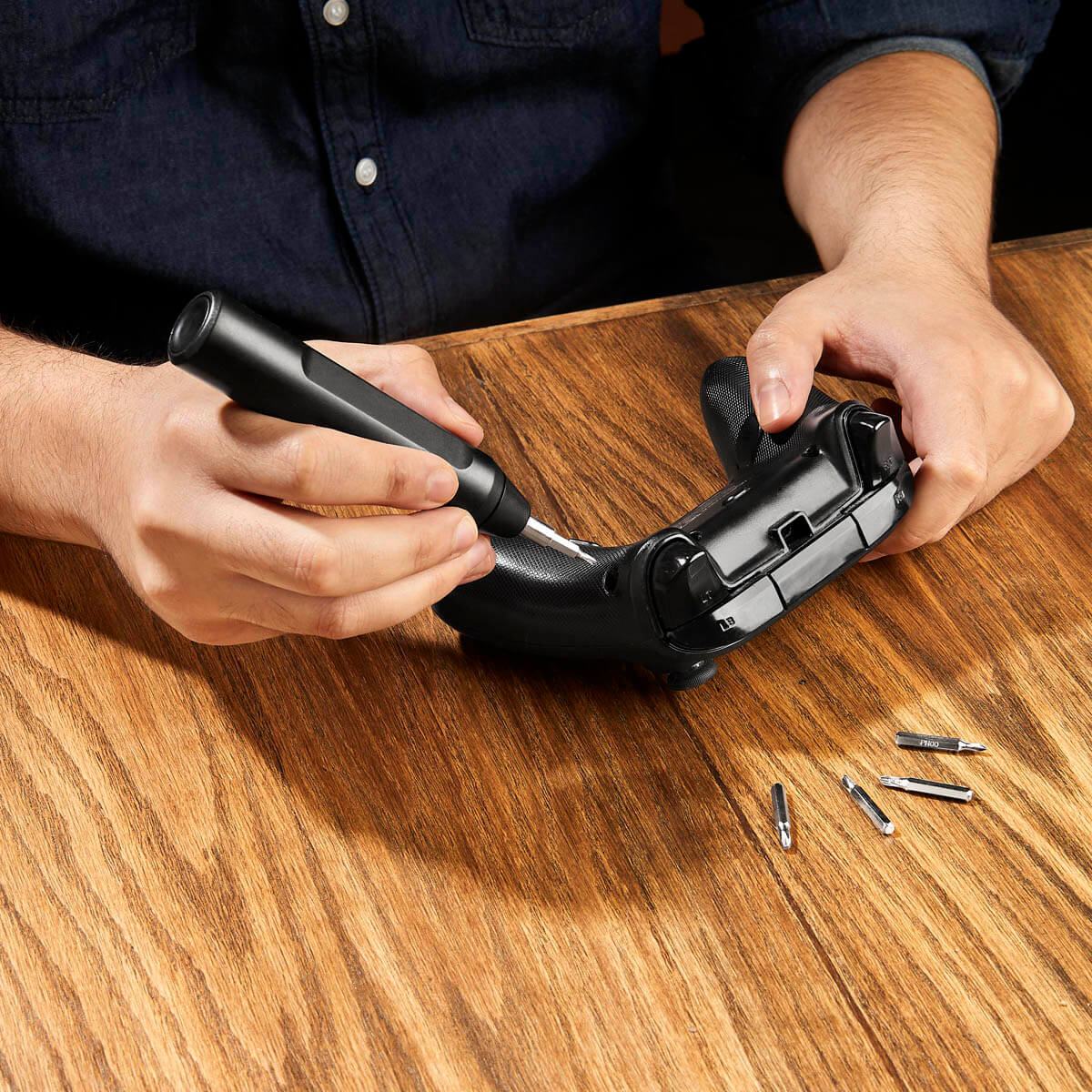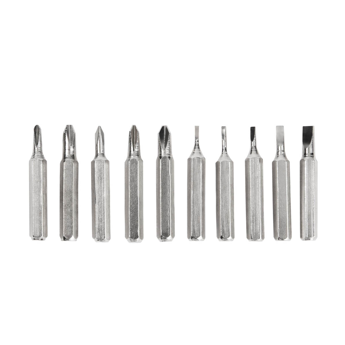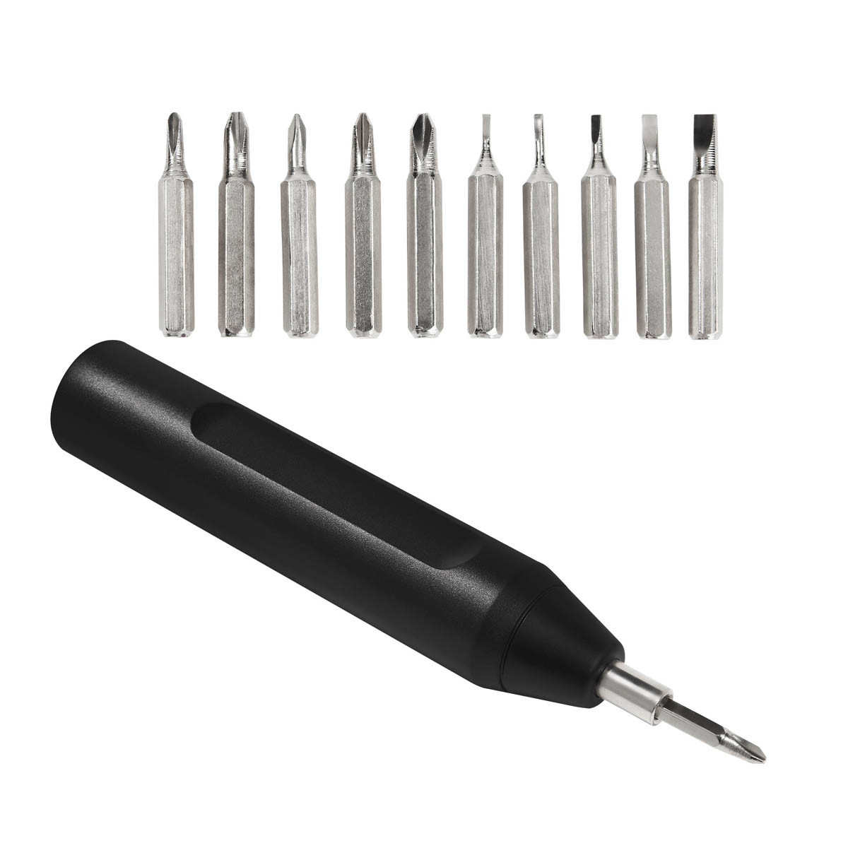 Desarmador con 10 puntas intercambiables. Incluye 5 puntas de cruz y 5 planas, organizadas en un compartimento interno que las mantiene seguras y al alcance de tu mano. Su innovador sistema push para abrir y cerrar asegura que las puntas permanezcan en su lugar, evitando perdidas y facilitando su uso.