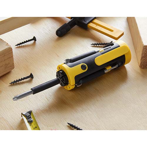 Contiene desarmador con clip, 6 puntas diferentes, 4 LEDS utiliza 2 baterias AAA (no incluidas).