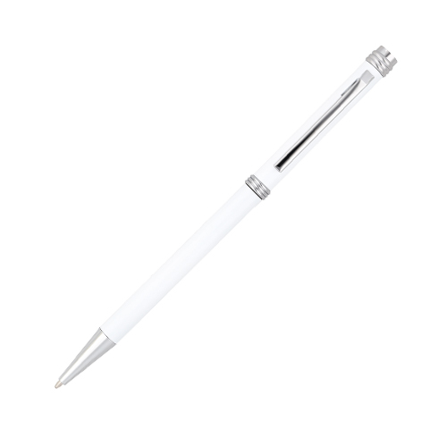 Bolígrafo metálico de diseño delgado con detalles plateados, clip y mecanismo retráctil.