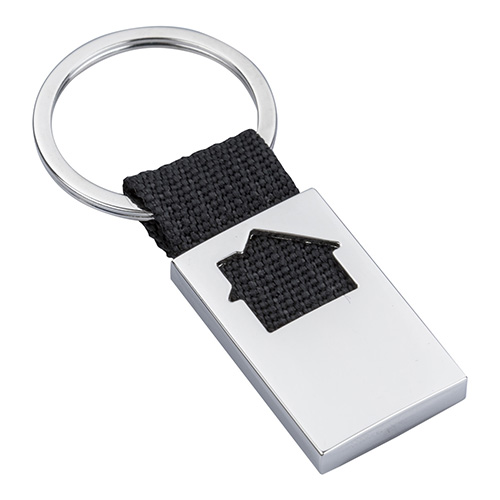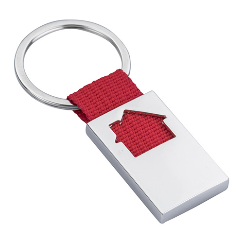 Llavero metálico con figura de casa y arillo reforzado.