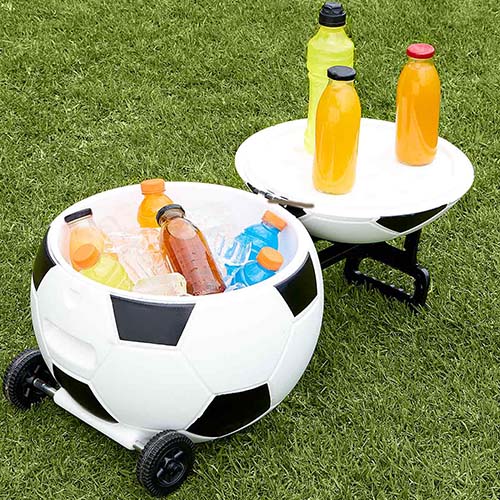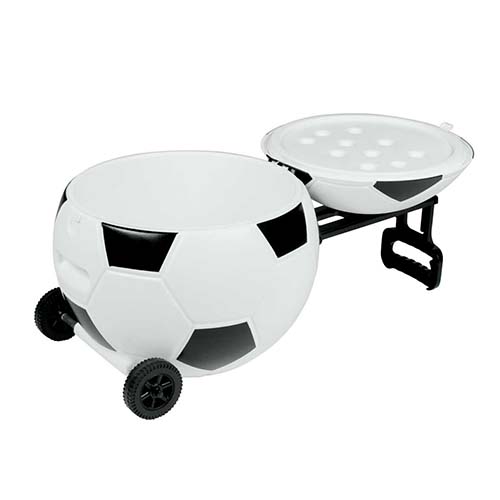 Hielera con 2 ruedas y mecanismo trolley. Tapa con funcion de charola con 3 portavasos moldeados.