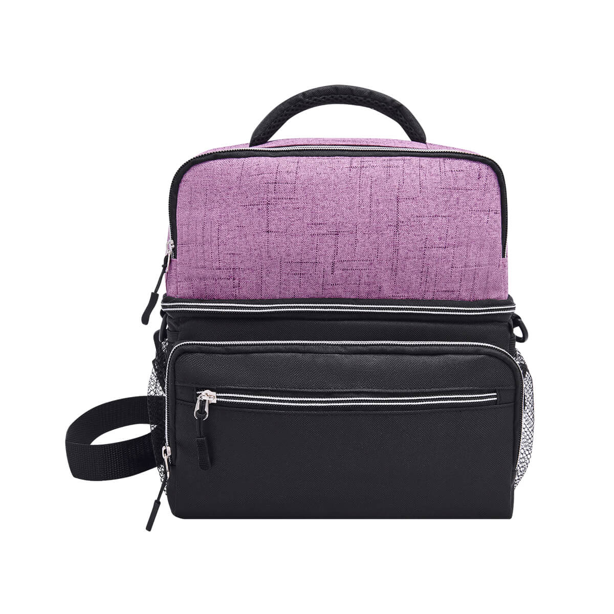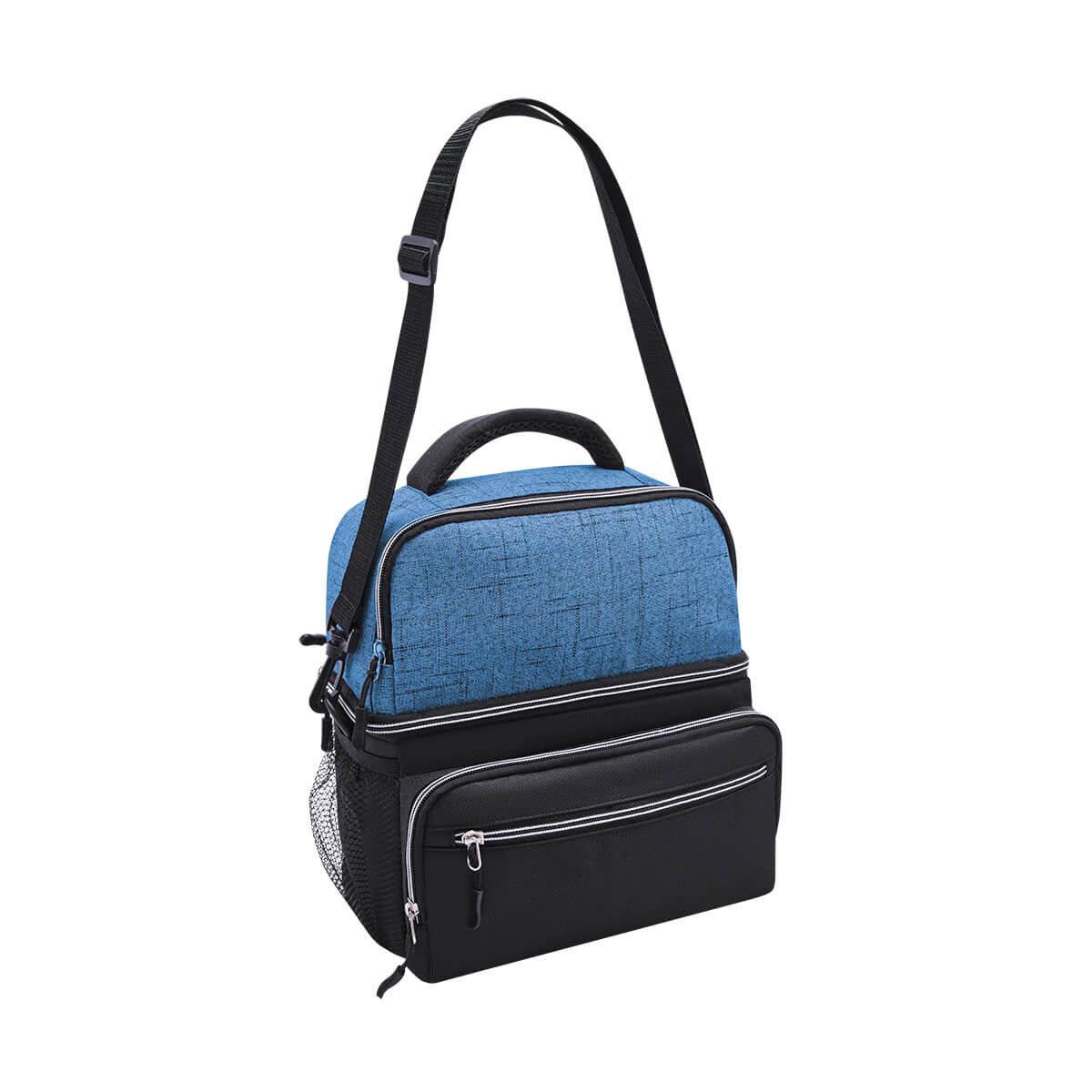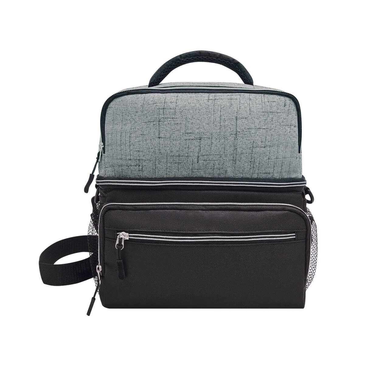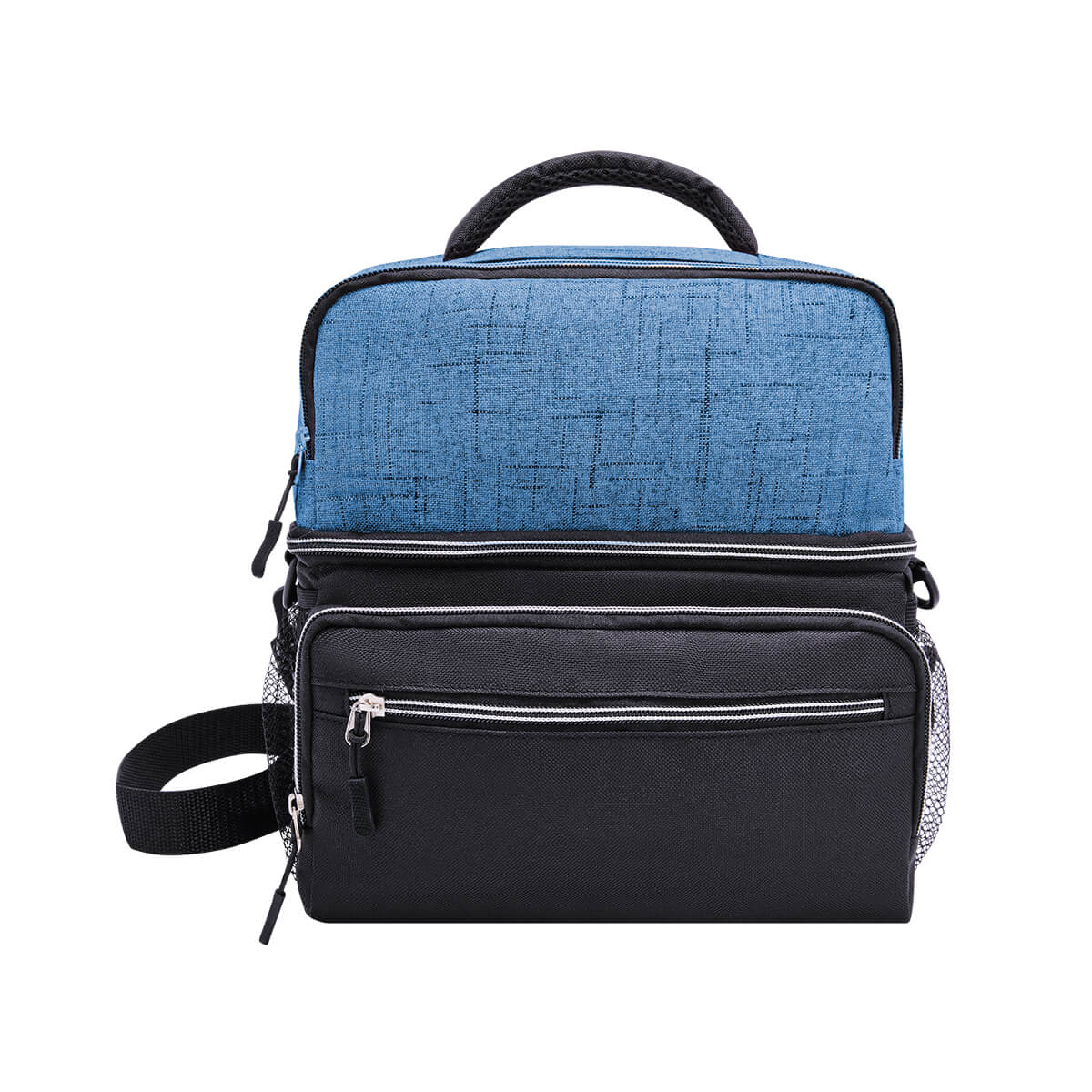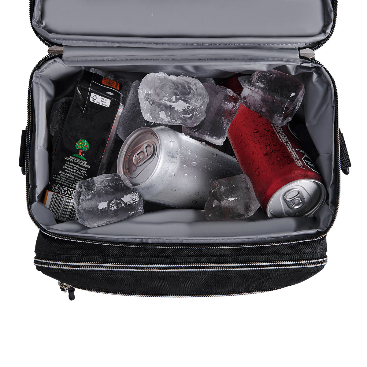 Interior plastificado impermeable. Bolsa principal con cierre, 2 bolsillos frontales con cierre, bolsa frontal superior con cierre, 2 bolsas laterales de red. Incluye correa ajustable. Capacidad de 12 latas.