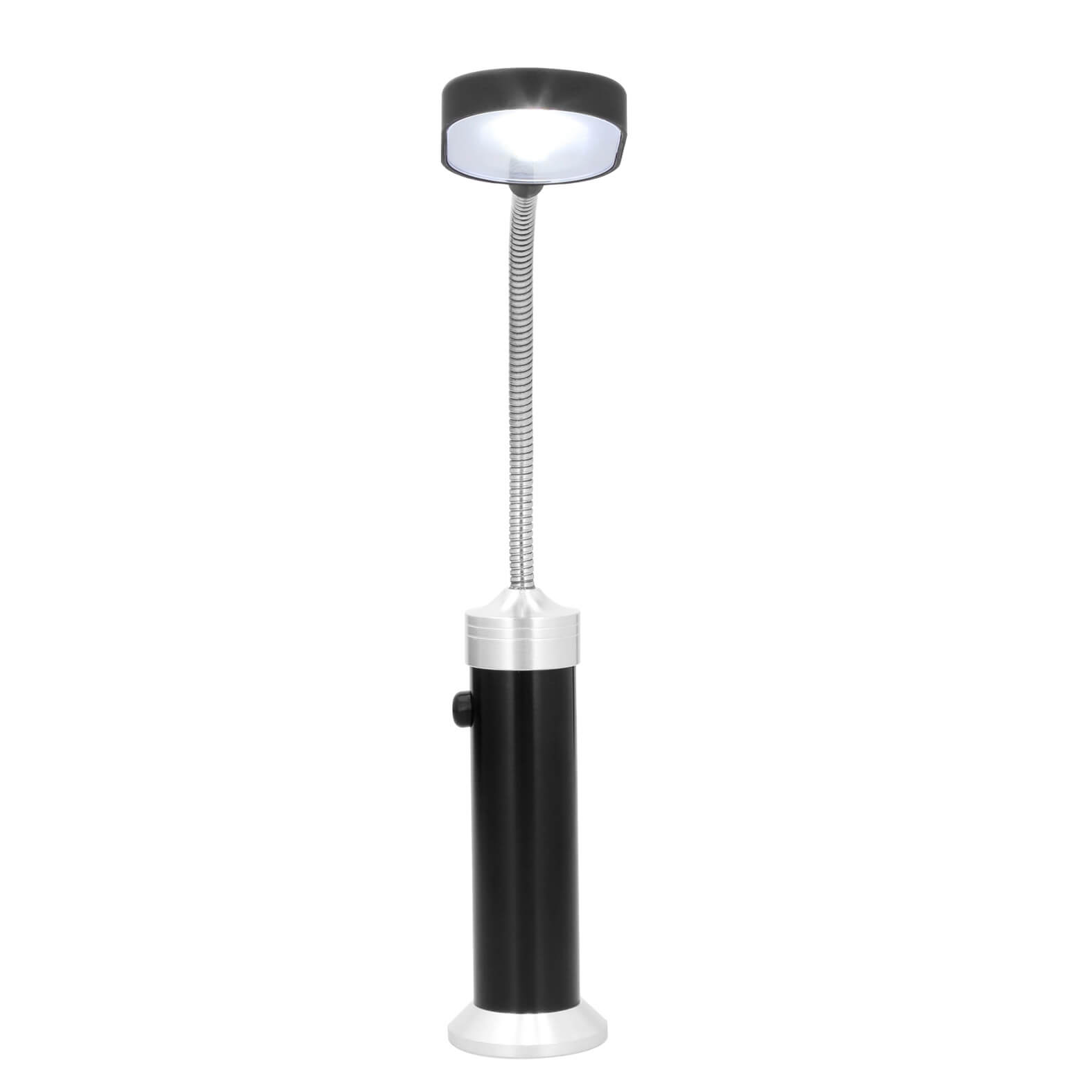 Lámpara portátil metálica con luz LED que enciende con 3 baterías AAA (no incluidas), botón de encendido de click, soporte flexible e imán en la parte inferior.