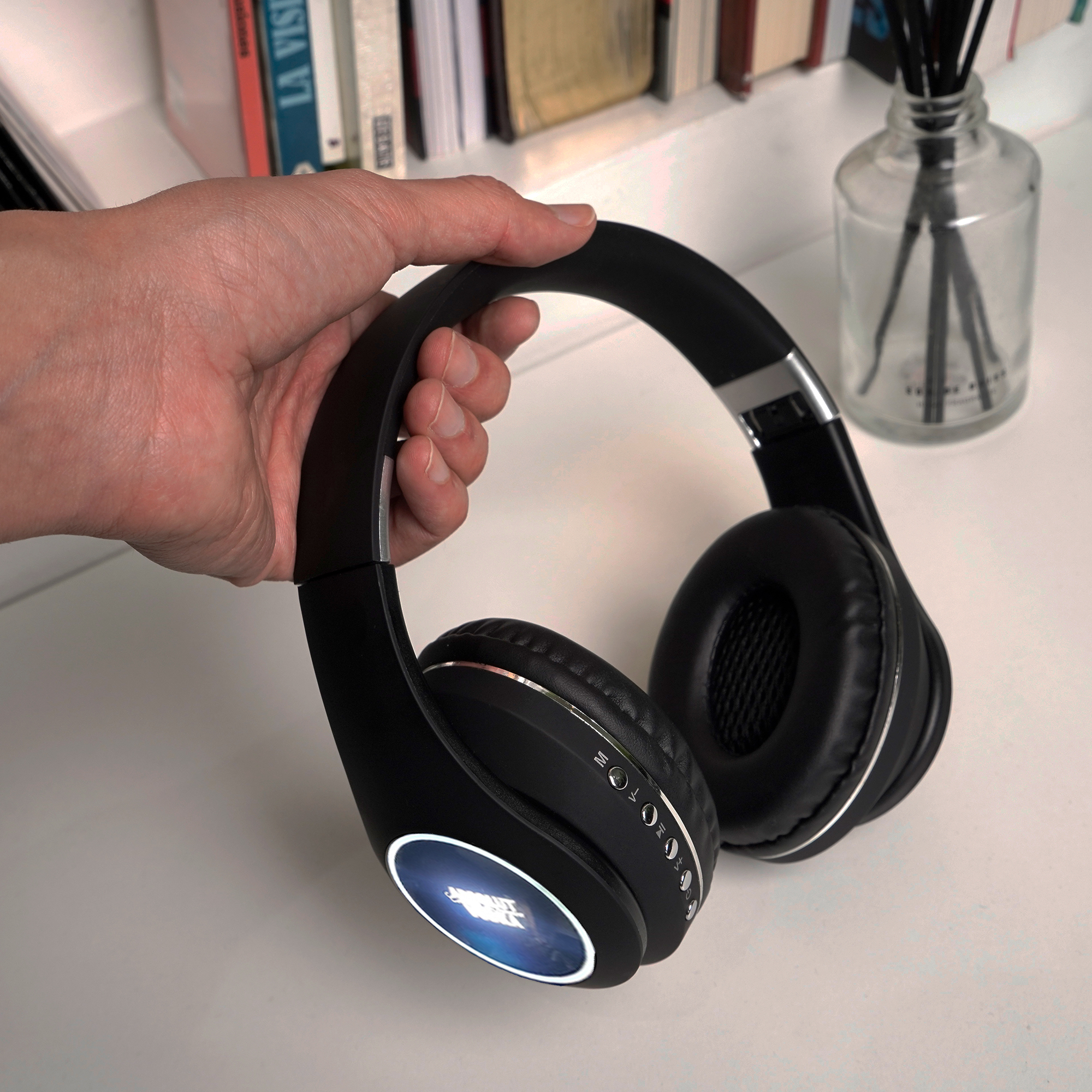 Audífonos plegables bluetooth de plástico con acabado rubber con función de manos libres, controles de llamada, volumen, reproducción de audio, botón de encendido y apagado, entrada tarjeta de memoria micro SD, radio FM, entrada micro USB y entrada aux. ( Se recomienda grabarlos para el destape en luz LED).