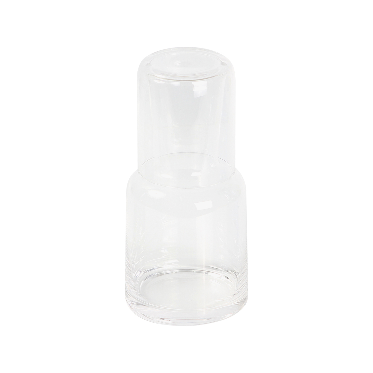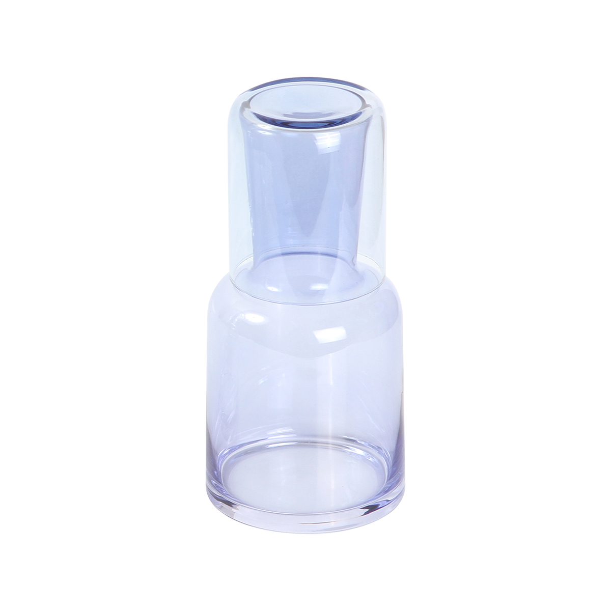 Jarra de vidrio con efecto translucido, capacidad de 700 ml. Incluye vaso con capacidad de 200 ml, que puede usarse como tapa para la jarra.