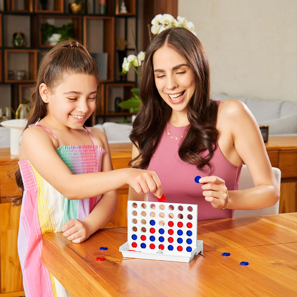 Tablero 4 en linea. Juego de mesa para dos jugadores. Contiene 21 fichas azules, 21 fichas rojas y base de plastico. El objetivo es alinear cuatro fichas sobre un tablero formado por seis filas y siete columnas. Por turnos, los jugadores deben introducir una ficha en la columna que prefieran (siempre que no este completa) y esta caera a la posicion mas baja. Gana la partida el primero que consiga alinear cuatro fichas consecutivas de un mismo color en horizontal, vertical o diagonal. Consulte el instructivo para abrir y cerrar el tablero.
