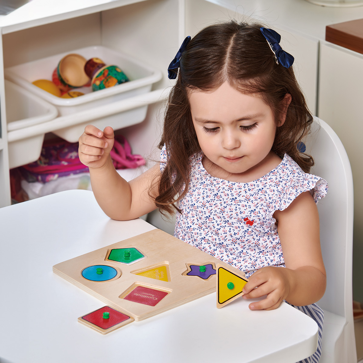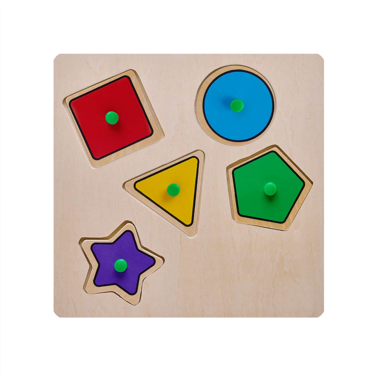 Juego de madera de resaque. Incluye 5 figuras geometricas con los nombres en ingles y espanol. Cada figura es de color diferente. Le permite a los pequenos aumentar el pensamiento logico, identificar las formas y colores asi como desarrollar sus sentidos y la motricidad como la coordinacion mano- ojo. La madera es un producto natural el cual puede presentar variaciones en tonalidades y vetas.