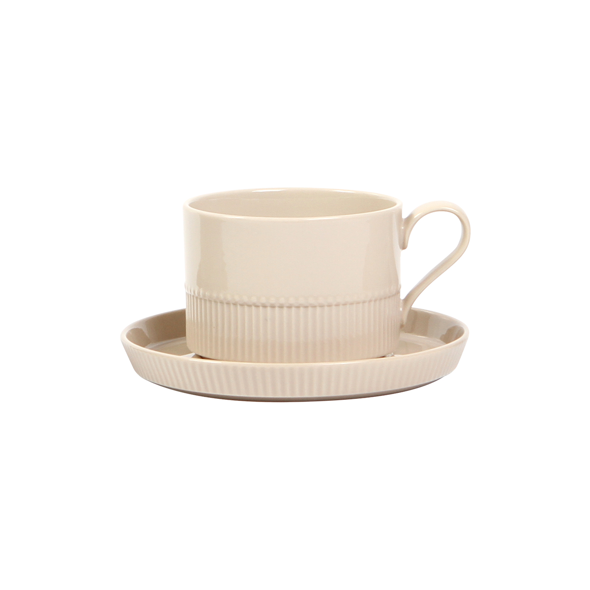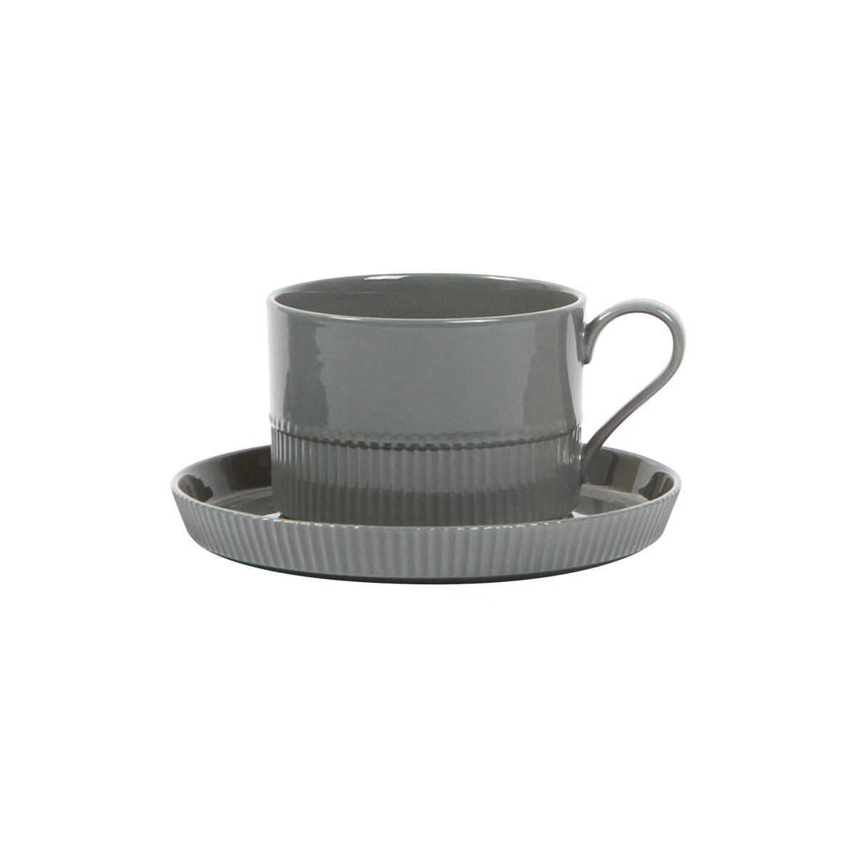Juego de té, incluye taza con plato fabricados en porcelana, con relieve de rayas en la parte inferior y diseño glowy.