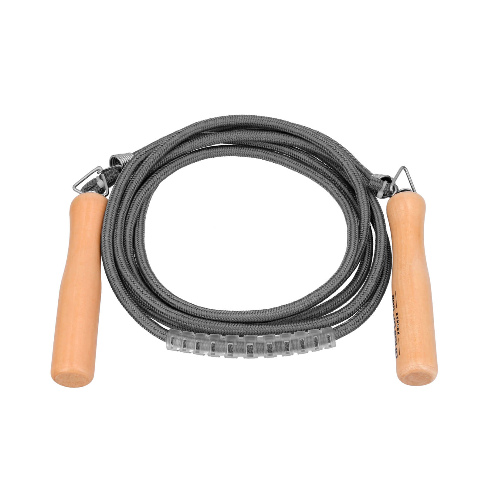 Cuerda deportiva de poliéster con mango de madera y seguros de metal con goma de equilibrio.