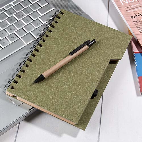 Libreta con 70 hojas de raya. Incluye boligrafo ecologico y espiral metalico doble.