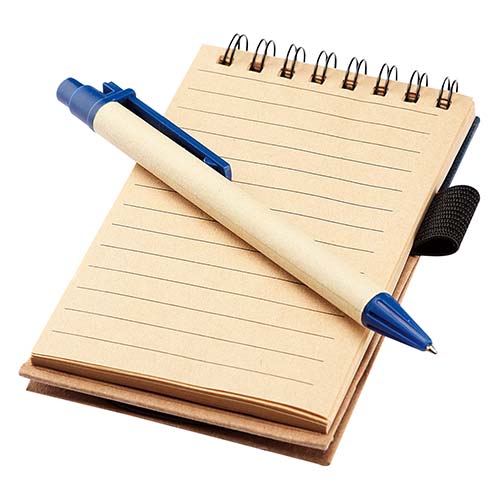 Libreta con 50 Hojas de raya. Incluye boligrafo ecologico y elastico para cerrar.