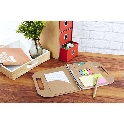 Libreta con 70 hojas de raya. Incluye 3 blocks de notas y banderillas adheribles de diferentes colores, boligrafo ecologico, compartimento para tarjetas, sobre en contraportada y espiral metalico doble.