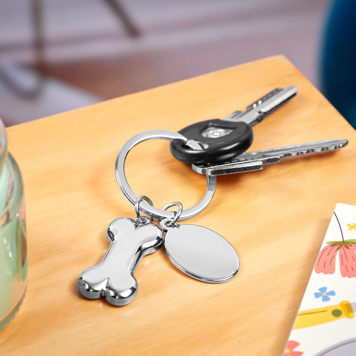 Llavero metalico con diseno en forma de hueso y placa redonda para grabado. Personalizalo con el nombre de tu mascota, una fecha especial o cualquier texto que desees. Ademas de mantener tus llaves organizadas, tambien te permite recordar a tus mascotas.