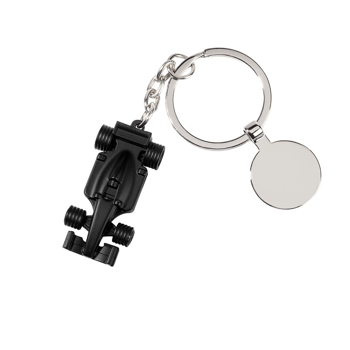 Llavero metalico con diseno de auto de carreras. Incluye placa metalica circular para grabado y caja individual.