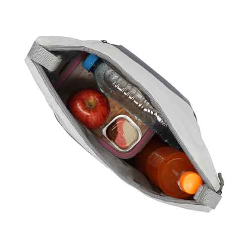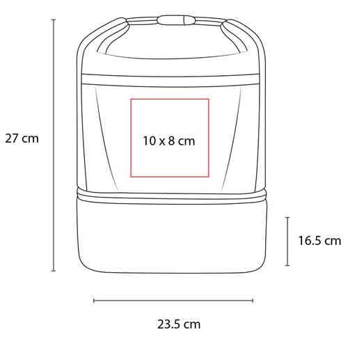 Interior plastificado. Doble compartimento con cierre. Bolsillo frontal. Agarradera con broche de plastico. Capacidad para 9 latas.