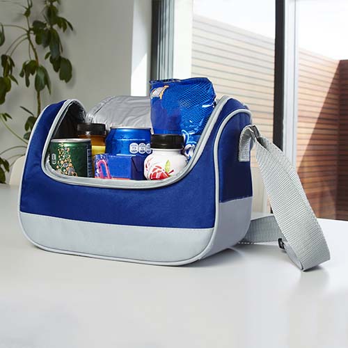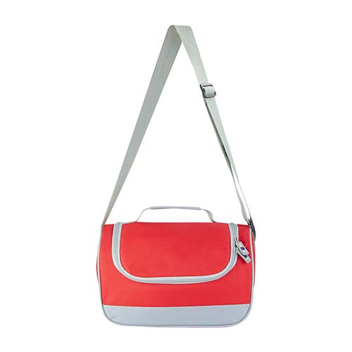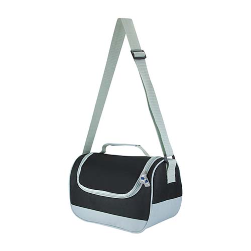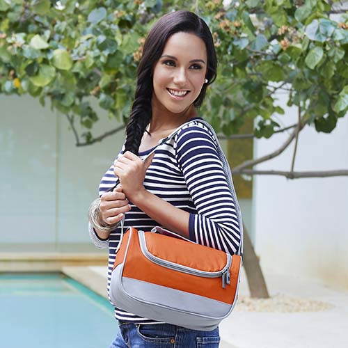 Interior plastificado. Bolsa principal con cierre. Asa de agarre superior y correa ajustable. Capacidad para 6 latas.