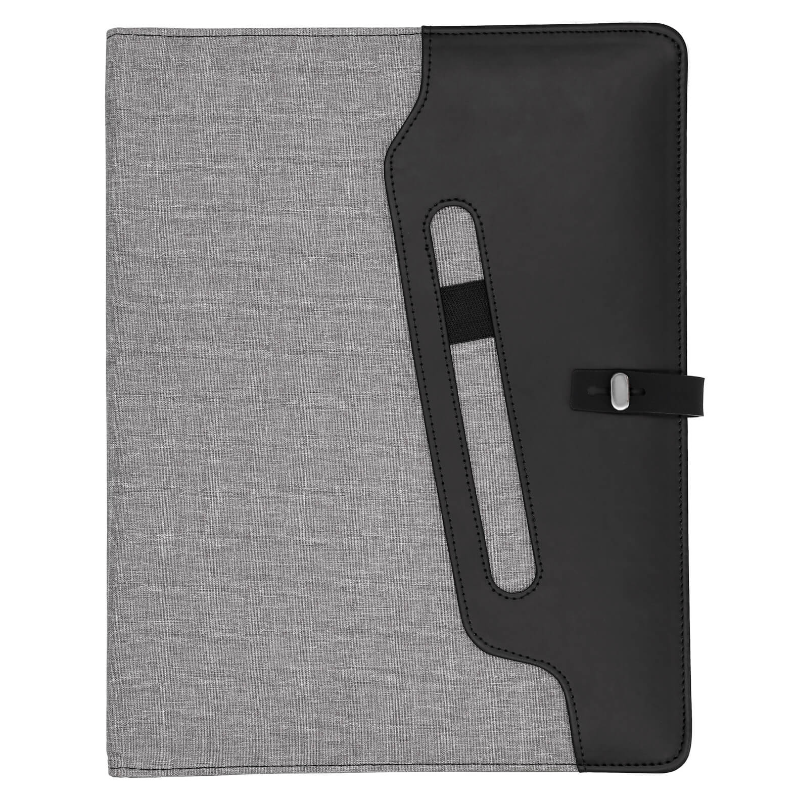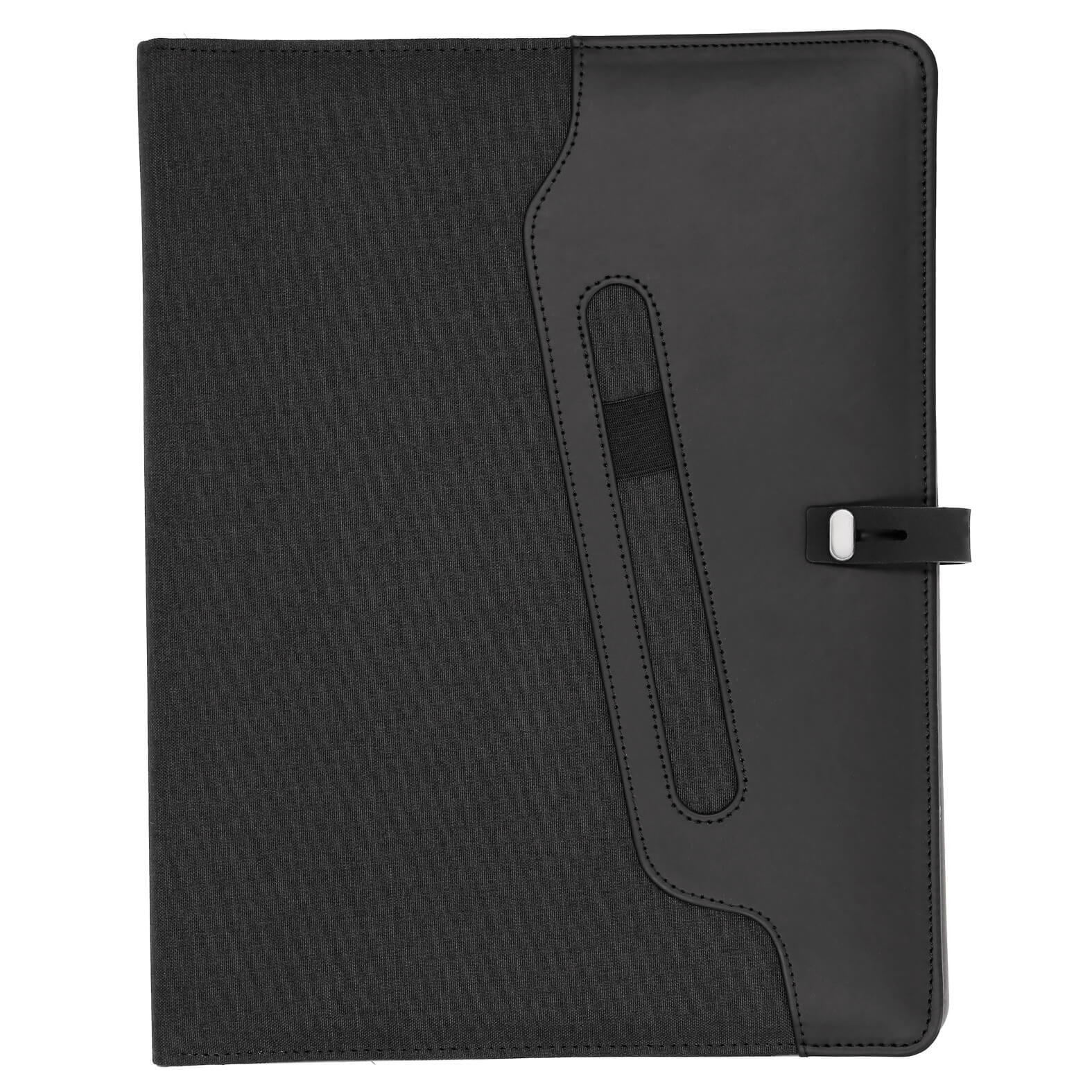 Carpeta multiusos con exterior de poliéster, broche y compartimento externo para bolígrafo. Cuenta con block de notas tamaño carta de 30 hojas rayadas, cintas elásticas para sujetar Smartphones y memorias USB u otros accesorios, compartimento con ventana plástica para credenciales, divisiones para tarjetas y bolsa de malla.