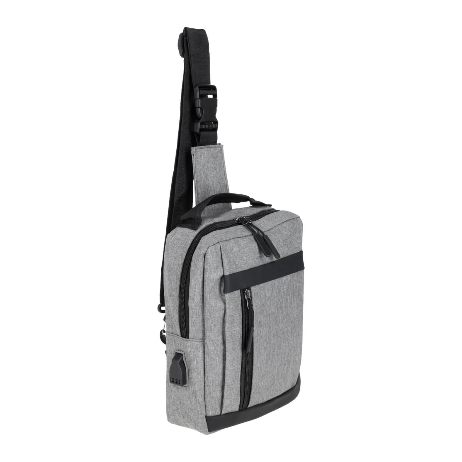 Bolsa de hombro con 2 compartimentos, 1 compartimento principal con bolsa interna y entrada lateral de batería portátil, 1 compartimento frontal, doble correa ajustable, broche de seguridad y asa superior.