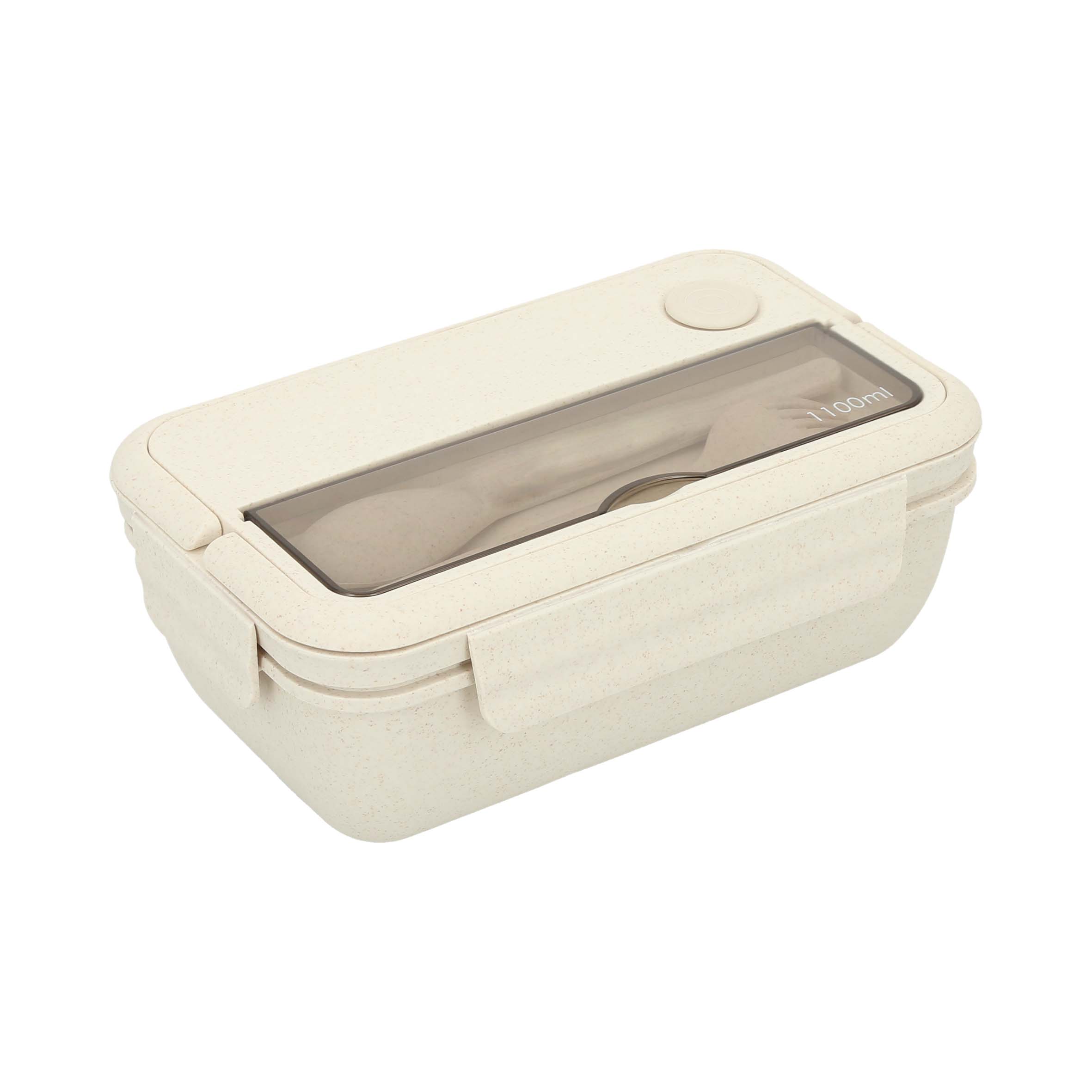 Contenedor para alimento de wheat Straw, con 2 compartimentos para alimentos,1 para cubiertos en la parte superior y soporte para celular. Incluye cuchara y tenedor. Capacidad de 1100 ml.