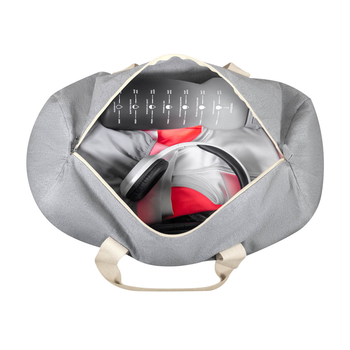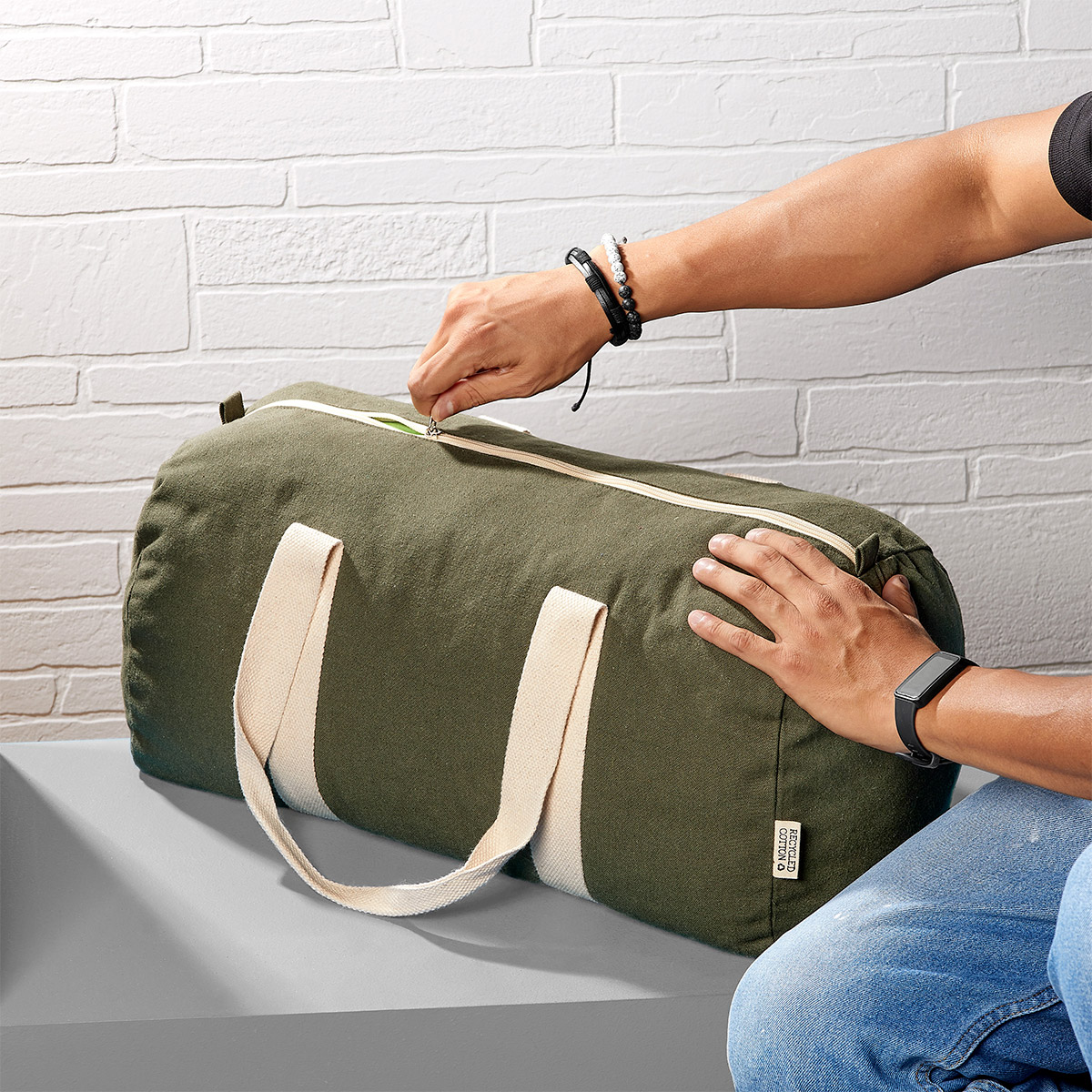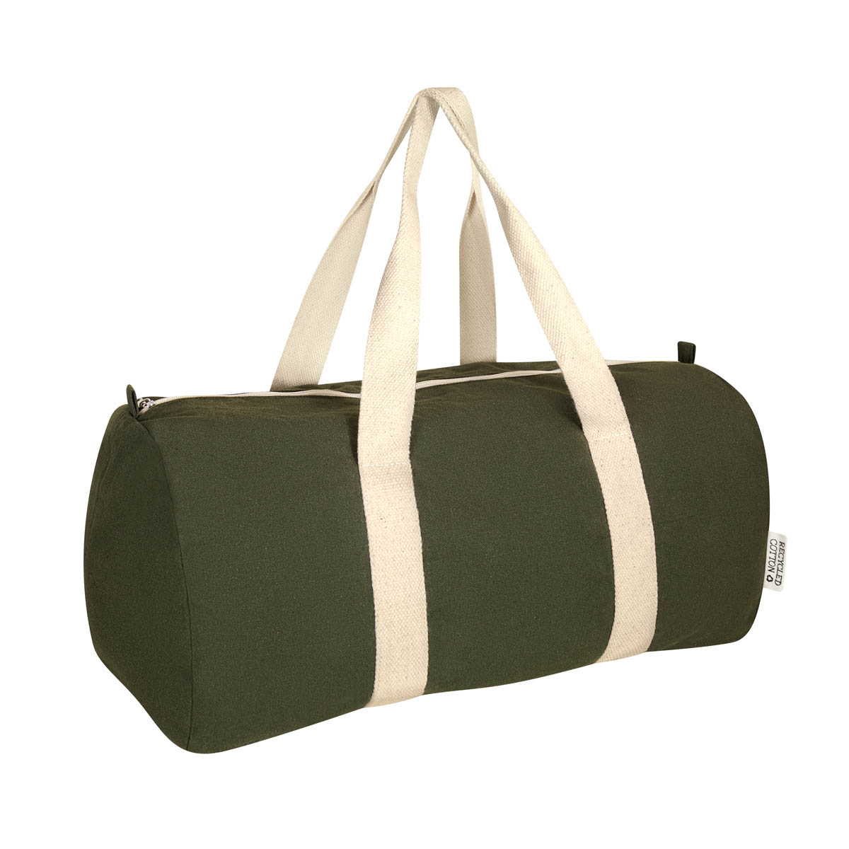 Maleta ecologica fabricada con algodon reciclado. Cuenta con un compartimento principal con cierre y dos asas para hombro.