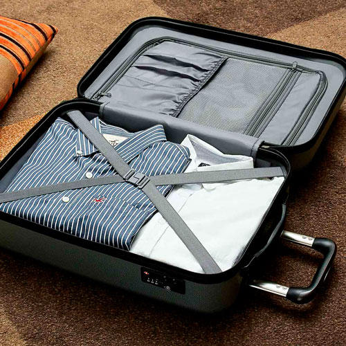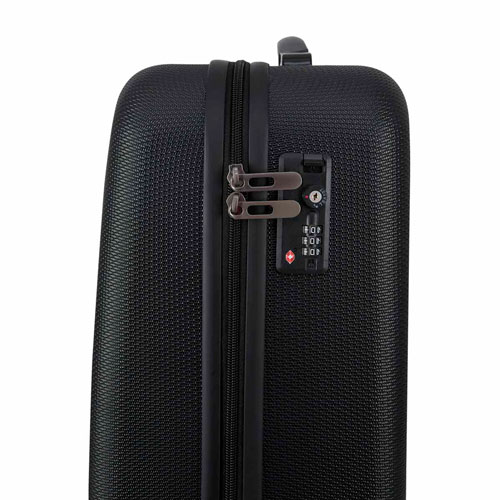 Maleta trolley con 4 ruedas. Incluye 4 compartimentos interiores, placa metalica removible para facil grabado y candado de seguridad TSA con combinacion de 3 digitos. Asa de agarre superior.