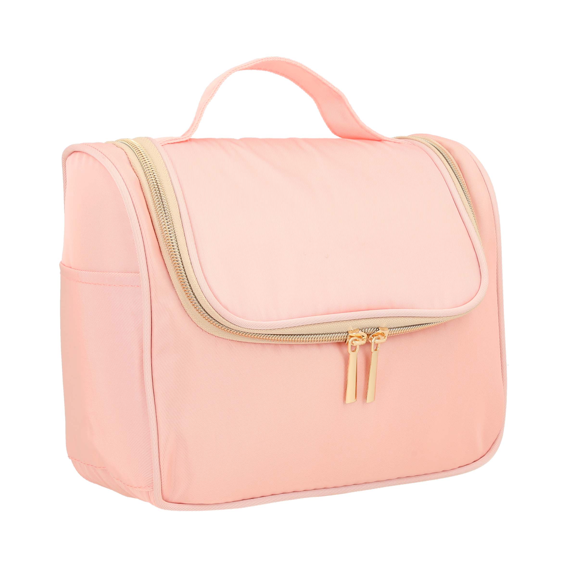Estuche de viaje, en la parte interior cuenta con un gancho, 3 separadores, 2 bolsas de malla laterales y un compartimento de malla con cierre en la parte superior, por la parte exterior incluye 2 bolsas laterales y asa.