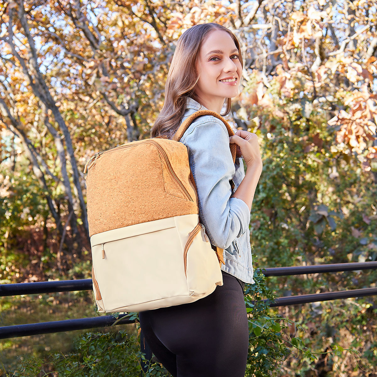Mochila con curpiel y corcho. Bolsa principal cuenta con espacio para laptop de 15". Bolsillo frontal con cierre y dos bolsillos laterales para tus objetos esenciales. Parte trasera acolchada ofrece mayor confort. Incluye banda para colocar en trolley, asas para hombro ajustables y asa superior.