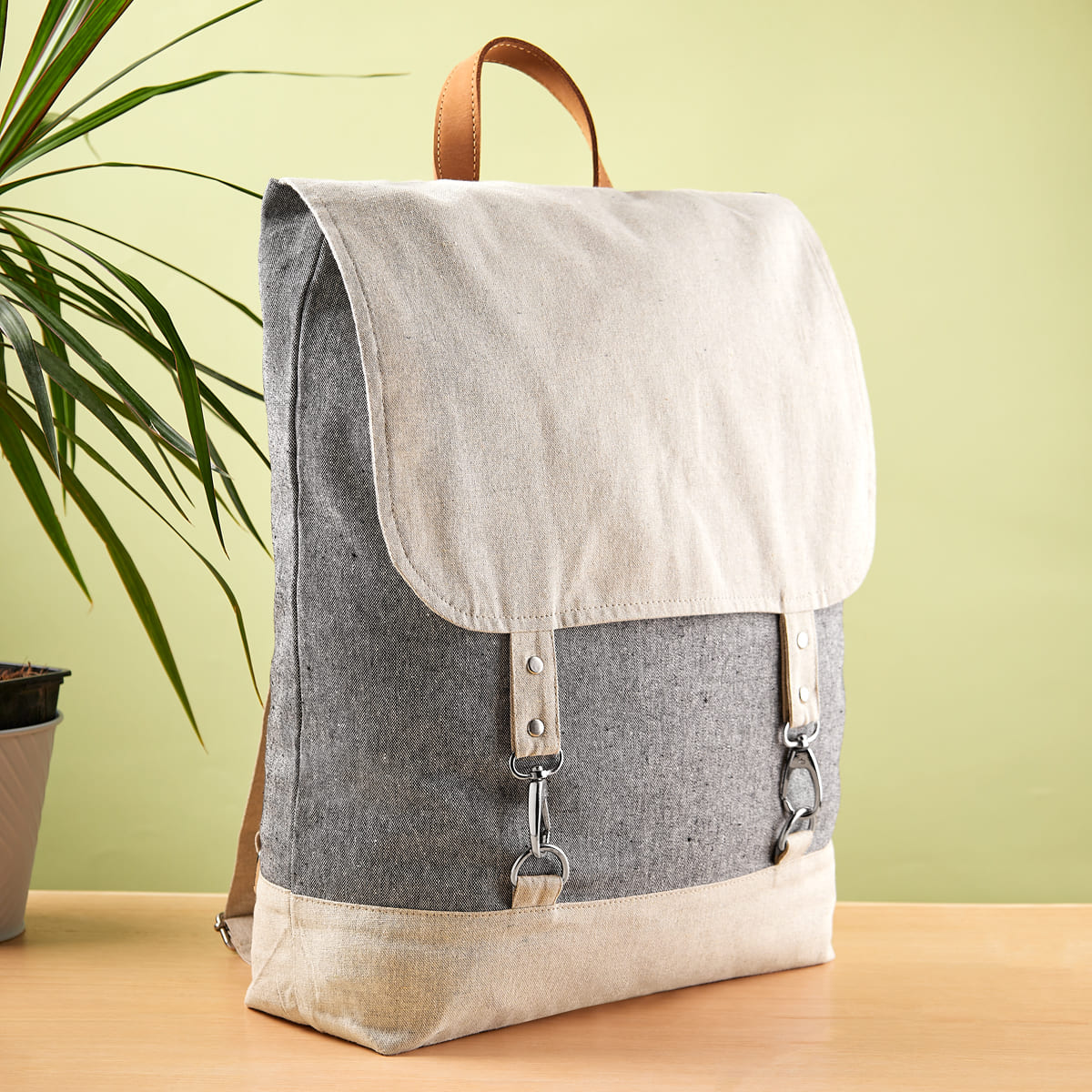 Mochila ecologica de algodon reciclado. Compartimento principal con cerrado de solapa y 2 broches metalicos. Asa superior y asas para hombro ajustables.