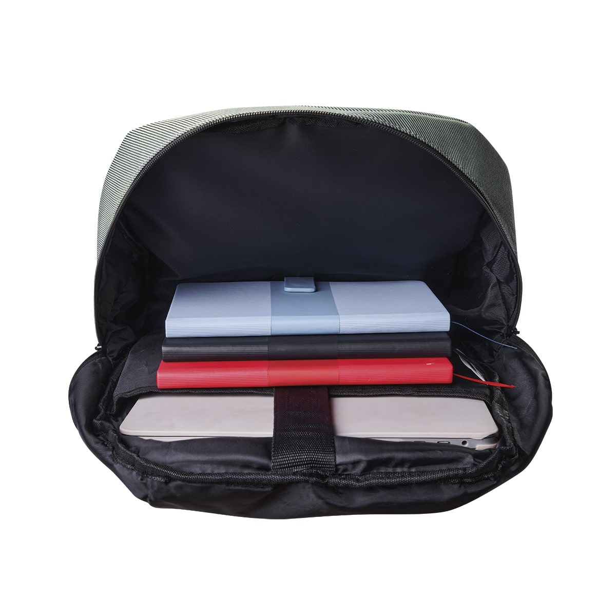 Material texturizado. Bolsa principal con cierre y compartimento interno para laptop de 14". Bolsa frontal con cierre oculto. Incluye asa superior acojinada y banda trasera para sostener en trolley. Tirantes ajustables.