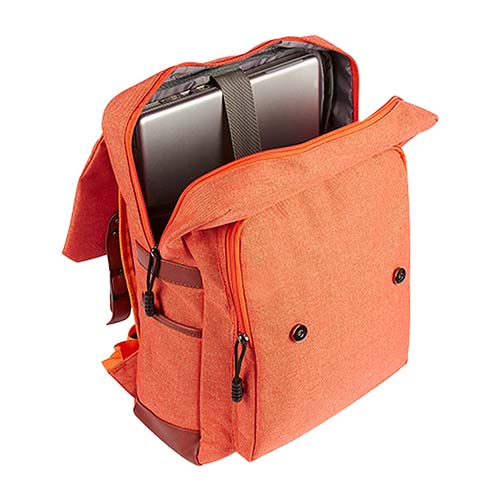 Bolsa principal y frontal con cierre. Compartimento para laptop hasta de 15". 2 bolsas laterales. Solapa frontal con broches de iman estilo hebilla. Cuenta con asa de agarre superior.