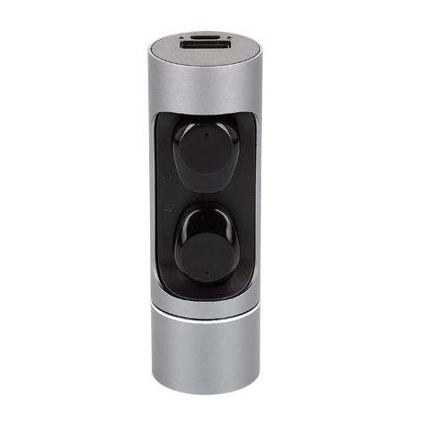 Audífonos bluetooth con botón de encendido/apagado y mecanismo touch. Incluye estuche de aluminio recargable con power bank integrada, gomas de repuesto y cable de carga.
