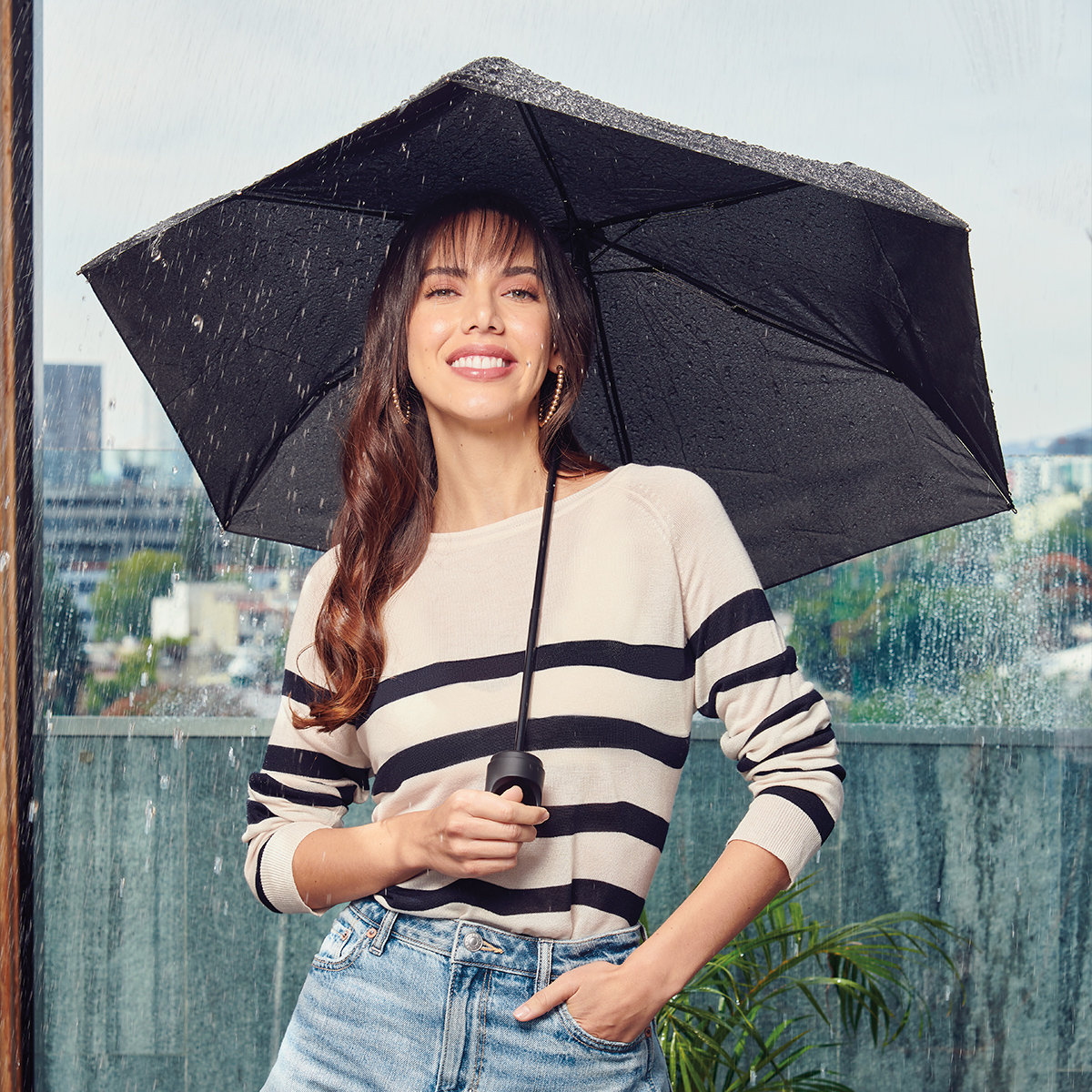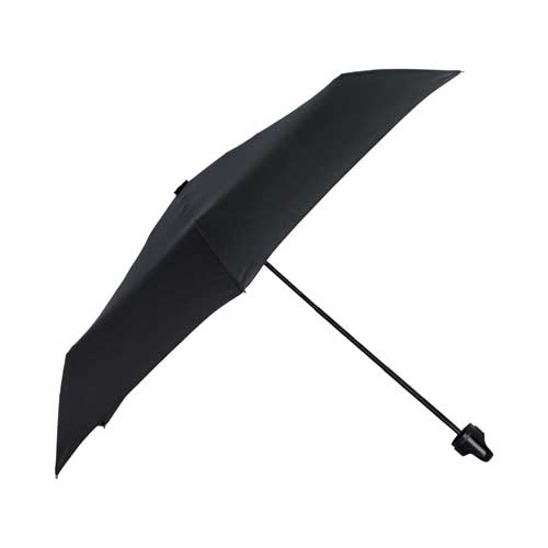Automatico. 6 Paneles. Paraguas de bolsillo con mango de gancho plastico. Incluye estuche metalico.